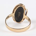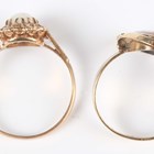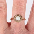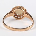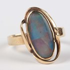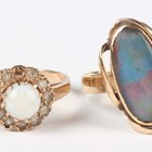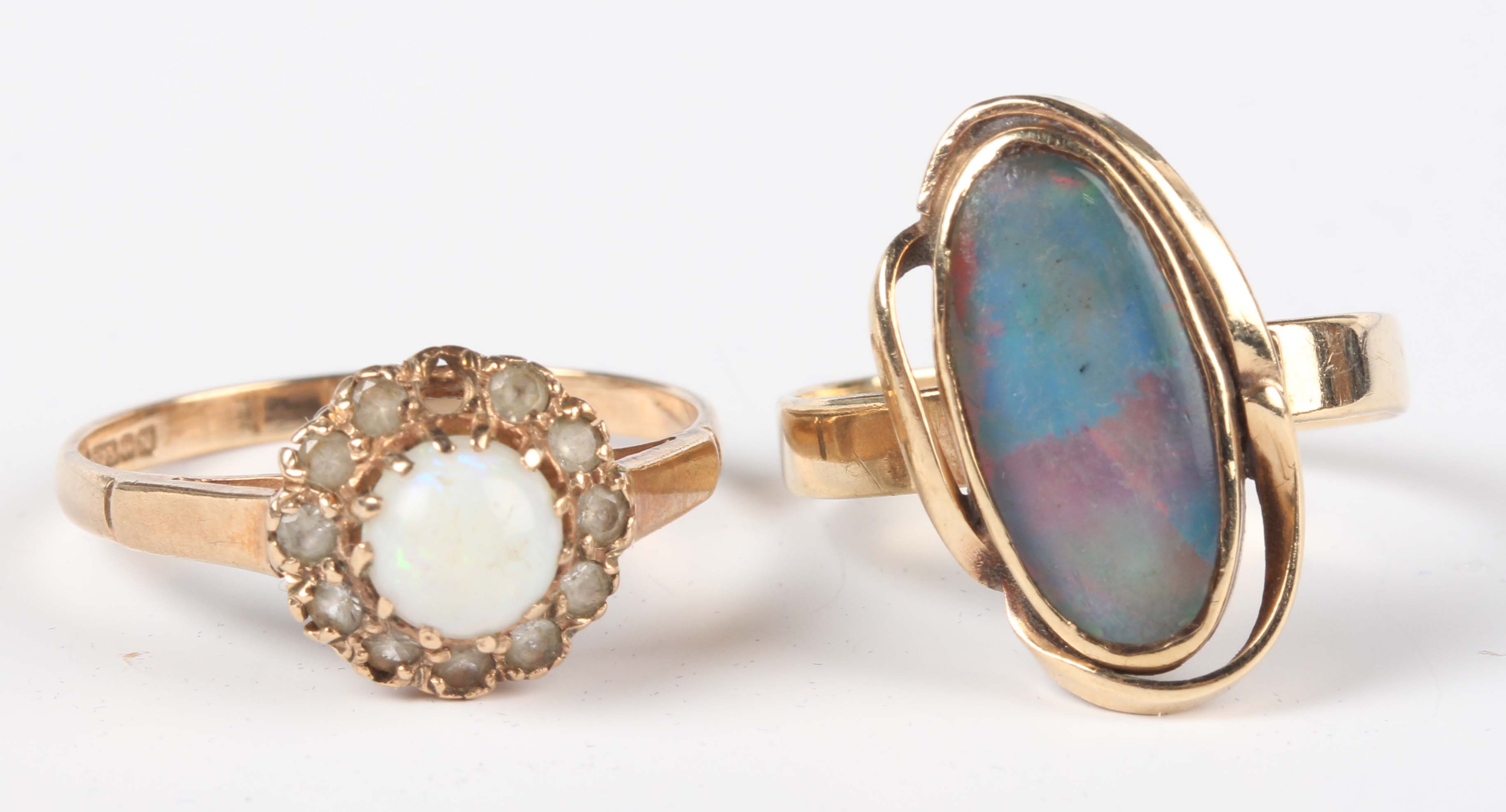 A gold ring, mounted with an oval opal doublet in an abstract design, detailed ‘9ct’, ring size approx P, and a 9ct gold, opal and colourless gem set cluster ring, ring size approx T (one colourless gem lacking), total weight 5.5g.