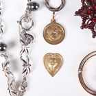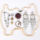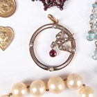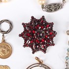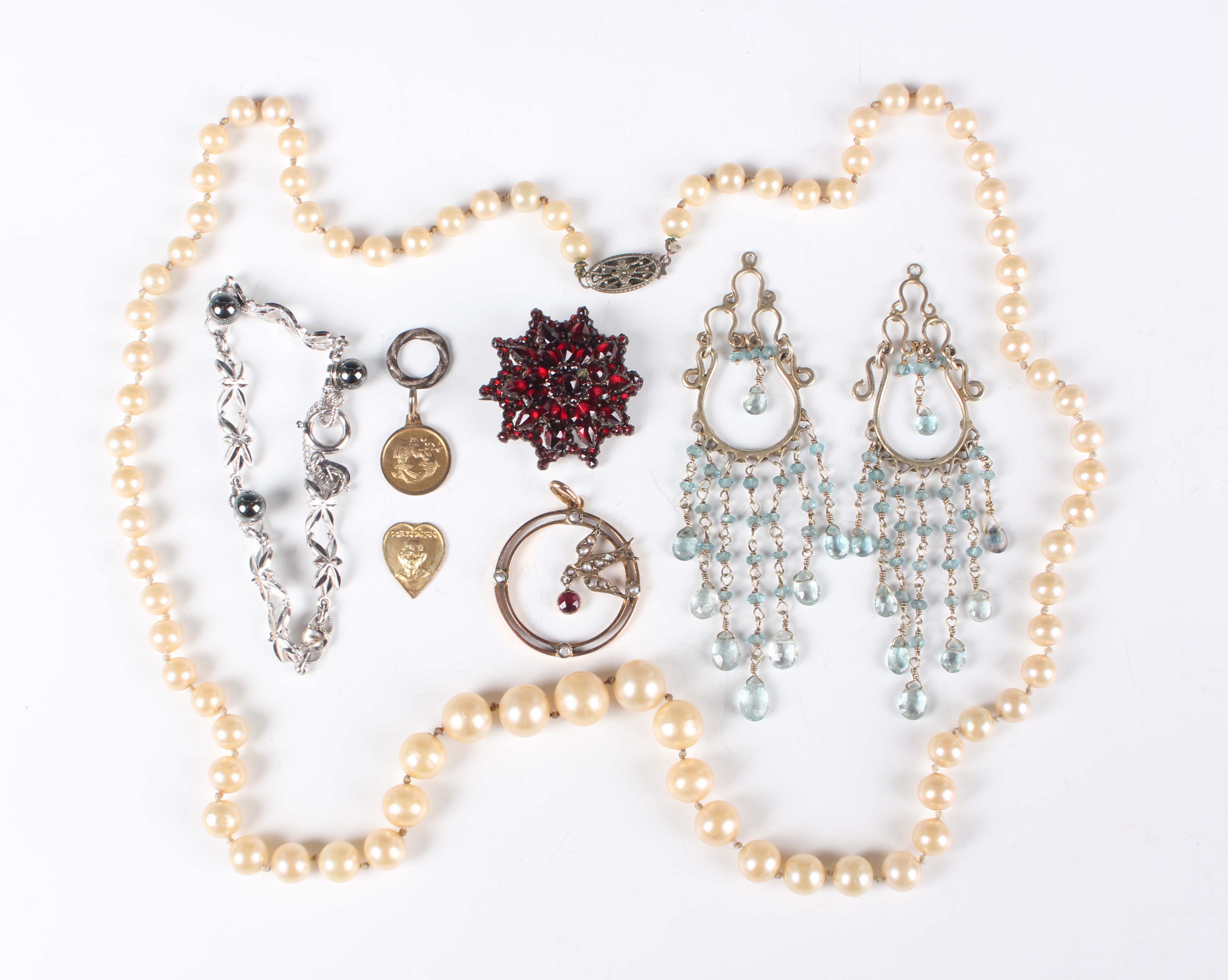 A Bohemian garnet brooch, designed as a starburst, width 2.9cm, a gold, seed pearl and ruby pendant with a bird motif, detailed ‘9ct’, weight 2.6g, length 3.4cm, and six further items.