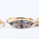 A gold, platinum and diamond two stone ring in a twist design, detailed ‘18ct&Pt’, weight 2.2g, ring size approx O, a gold, ruby and diamond five stone ring, detailed ‘18ct’, and a gold, diamond, synthetic sapphire and sapphire ring, detailed ‘18ct’, total weight 5.2g.