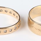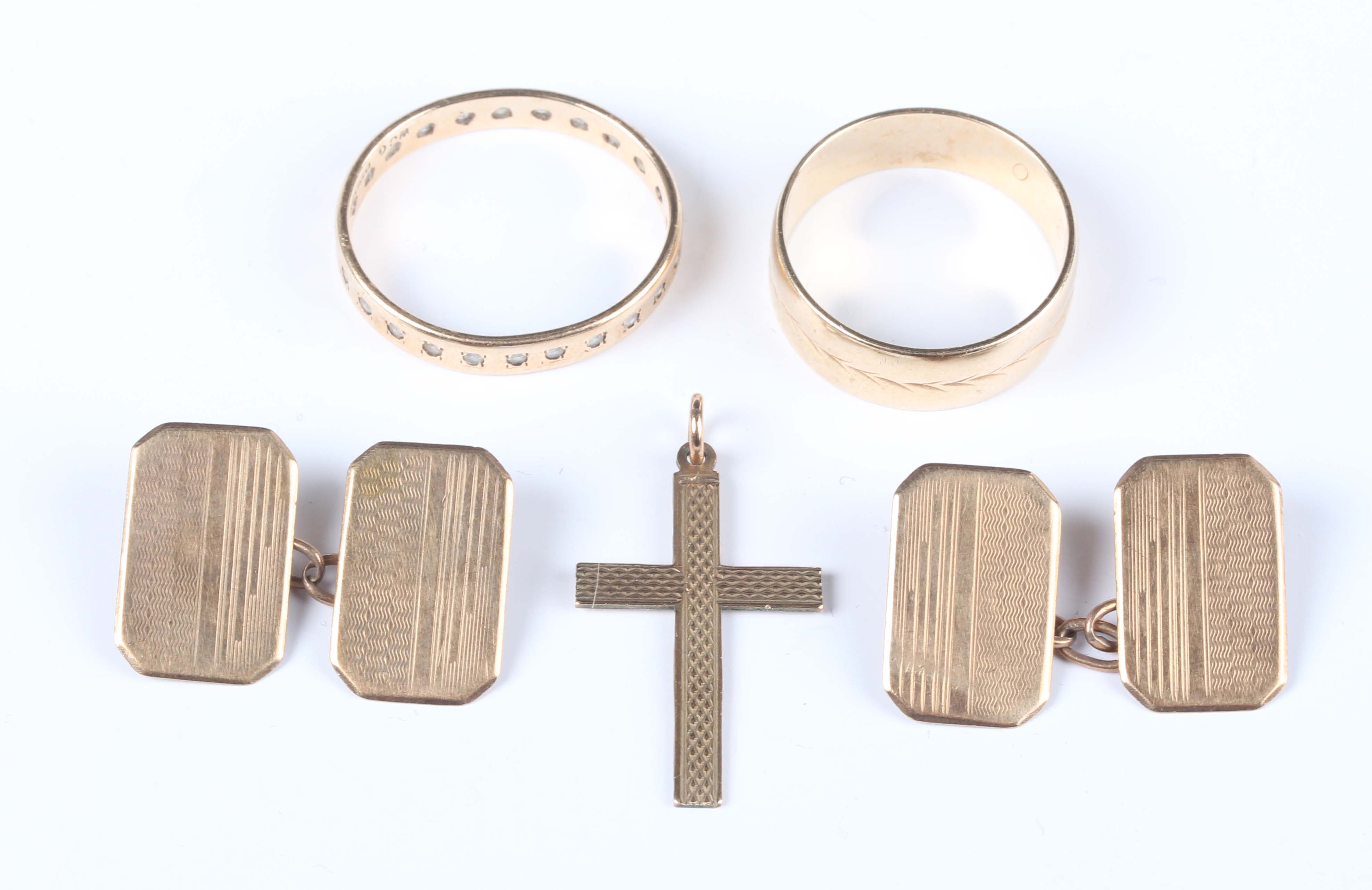 A pair of 9ct gold cut cornered rectangular cufflinks, Chester 1937, dimensions of each front 1.6cm x 1cm, a 9ct gold and colourless gem set eternity ring, a 9ct gold wedding band ring and a 9ct gold pendant cross, total weight 9.7g.