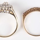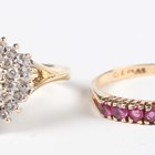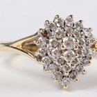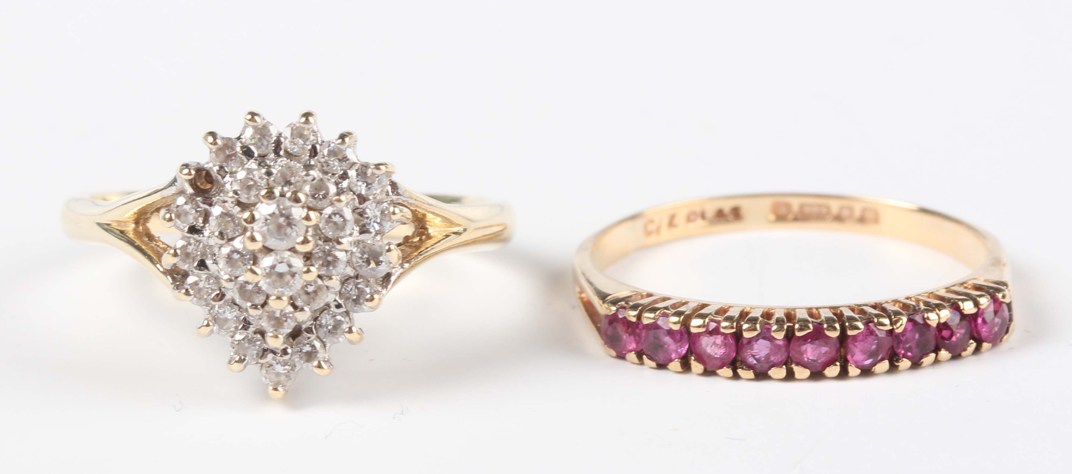A 14ct gold and colourless cubic zirconia pear shaped cluster ring, weight 3.6g, ring size approx O1/2 (one cubic zirconia lacking), and a 9ct gold and ruby nine stone half hoop ring, weight 1.3g, ring size approx N1/2.
