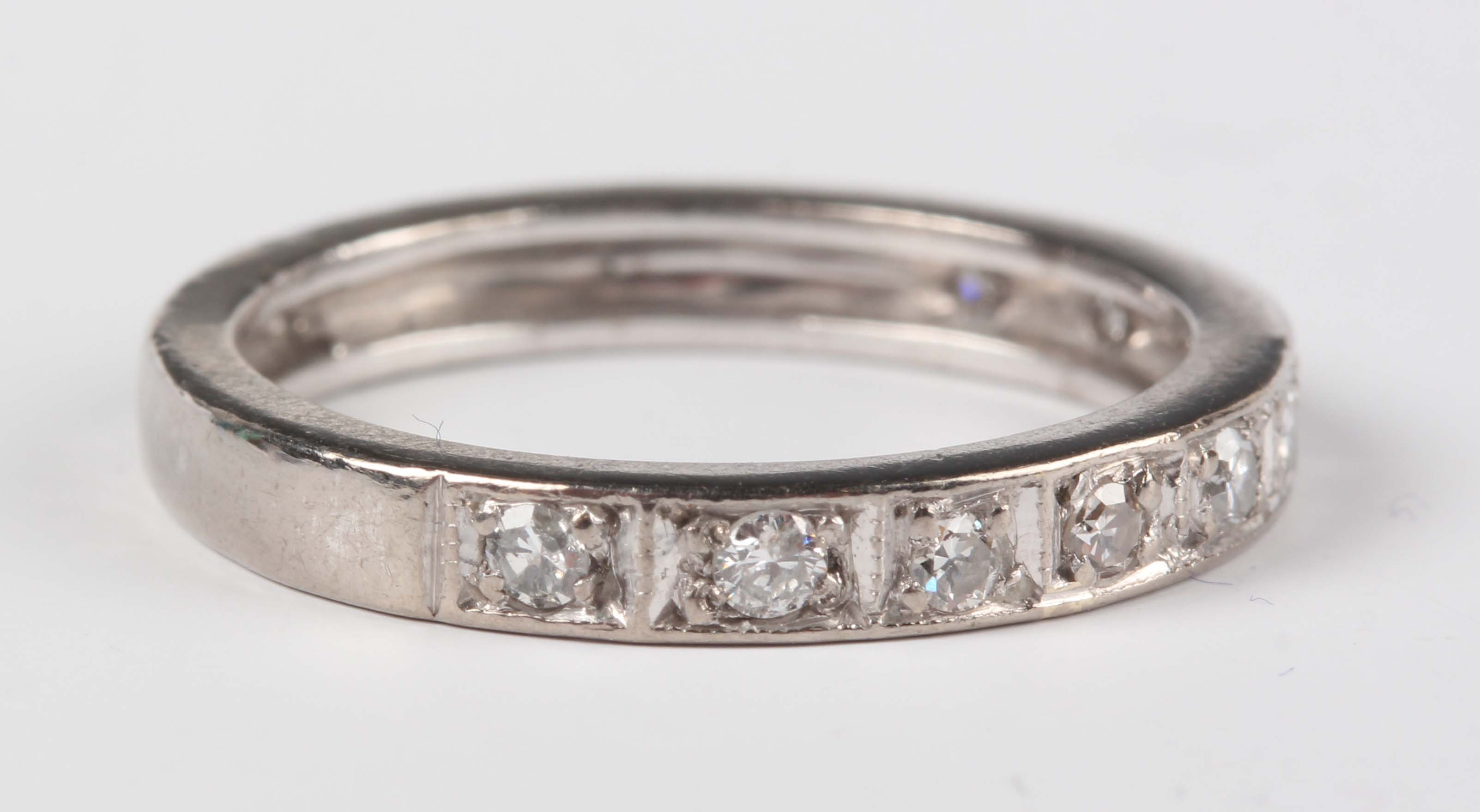 A white gold and diamond half eternity ring, mounted with ten circular cut diamonds, indistinct mark, weight 3g, ring size approx L1/2.