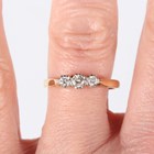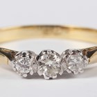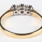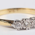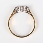 An 18ct gold and diamond three stone ring, claw set with a row of circular cut diamonds, detailed ‘.25’, import mark London 1994, ring size approx O.