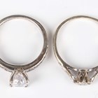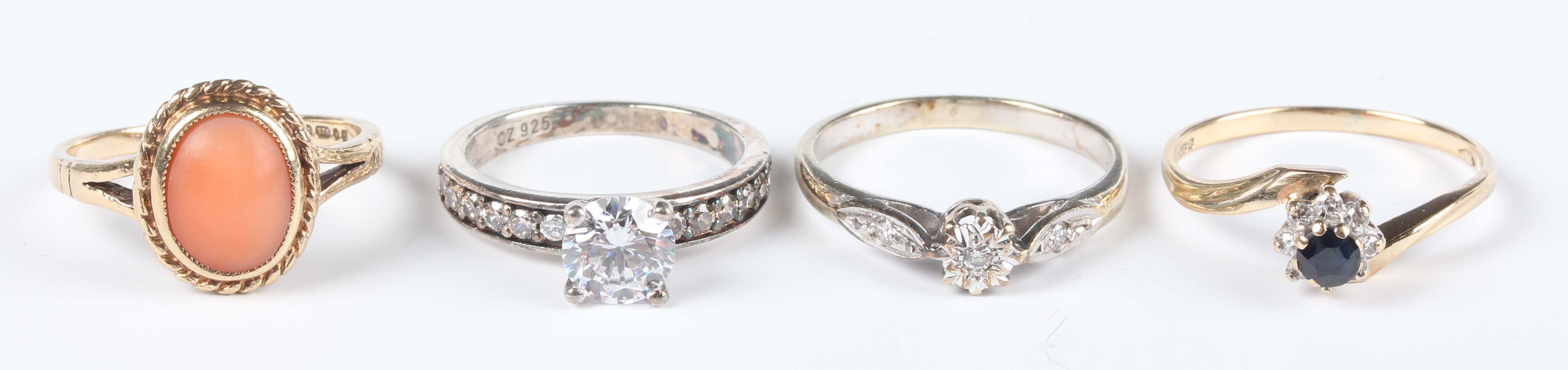 A 9ct gold and oval coral ring, London 1994, ring size approx J1/2, a 9ct gold, sapphire and diamond cluster ring in a twist design, ring size approx L1/2, a 9ct white gold ring, mounted with three circular cut diamonds, total weight 5.5g, and a silver and colourless cubic zirconia ring, detailed ‘CZ 925’.