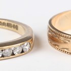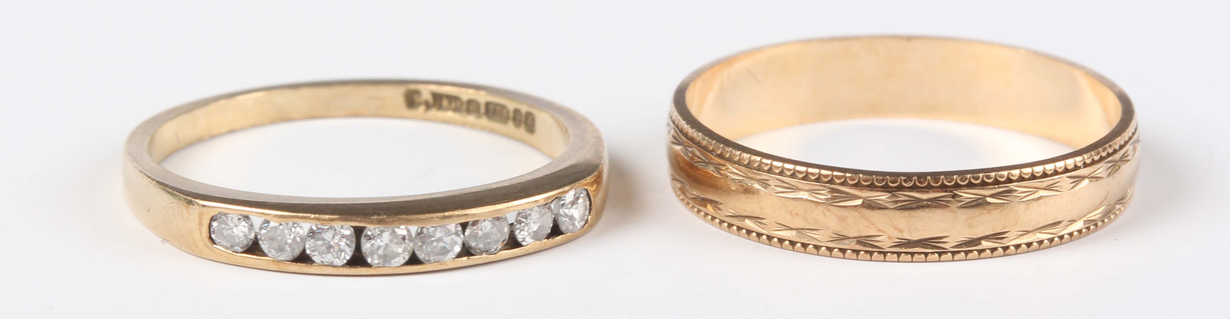 A 9ct gold and diamond half hoop ring, channel set with a row of eight circular cut diamonds, London 1990, ring size approx L1/2, and a 9ct gold decorated wedding ring, ring size approx M, total weight 3.1g.