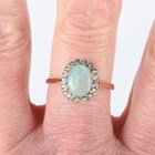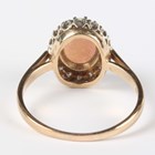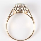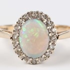 A 9ct gold, opal and diamond oval cluster ring, claw set with the oval opal within a surround of single cut diamonds, weight 3g, ring size approx Q1/2.
