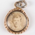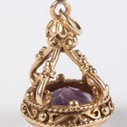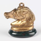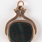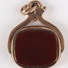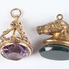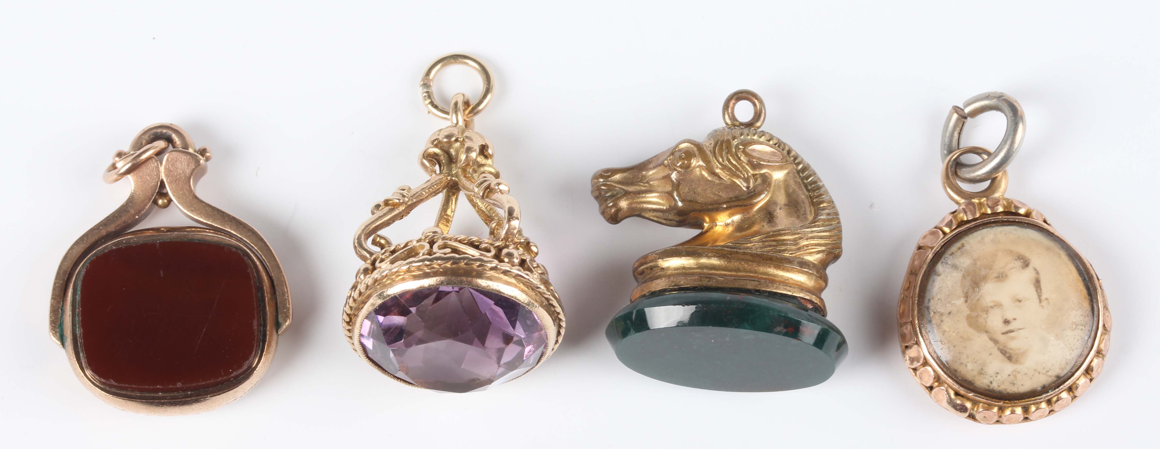 A 9ct gold mounted bloodstone and cornelian rotating pendant fob, Birmingham 1914, weight 4.1g, length 2.7cm, a gold mounted amethyst pendant fob, unmarked, weight 6.7g, a Victorian gold mounted circular pendant locket, glazed with a portrait of a boy, unmarked, weight 3.8g, and a gilt metal mounted bloodstone fob seal, designed as a horse’s head.