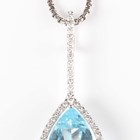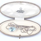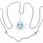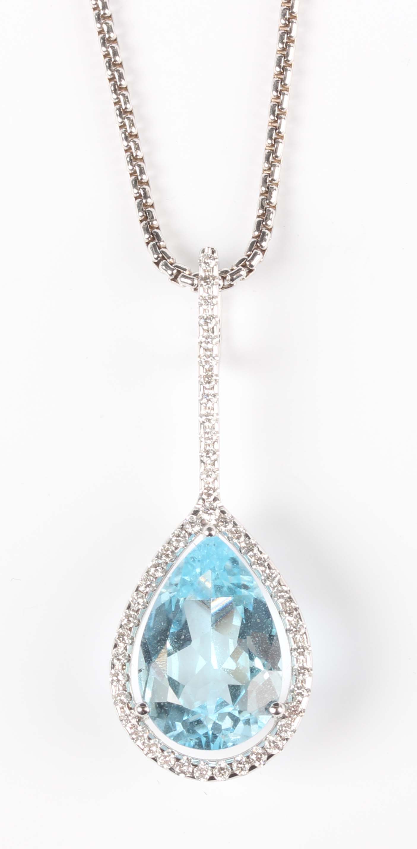 An 18ct white gold, blue topaz and diamond drop shaped pendant, claw set with a pear shaped blue topaz, otherwise set with small circular cut diamonds, numbered ‘5.990.38’, length 3.8cm, with a 18ct white gold box link neckchain on a sprung hook shaped clasp, detailed ‘750’, length 47.5cm, total weight 12.8g, with an associated Asprey case.