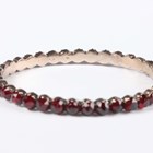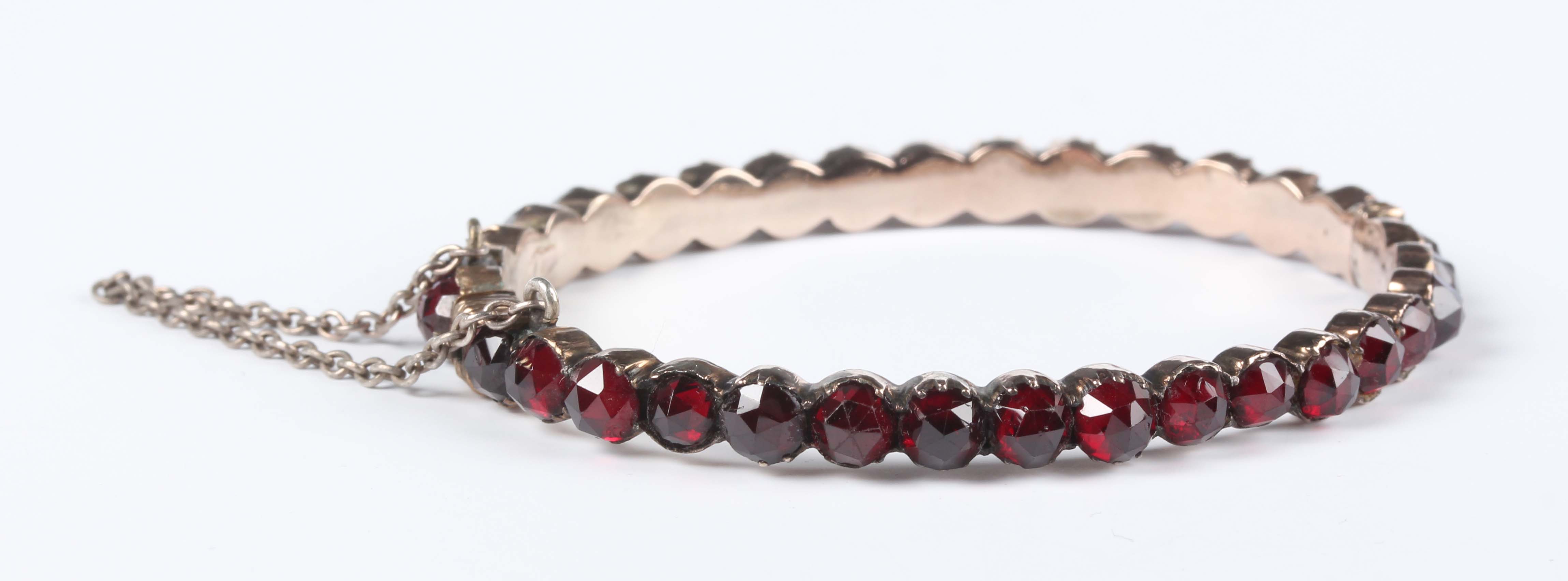 A Bohemian gilt metal and garnet oval hinged bangle on a snap clasp, inside width 5.2cm.