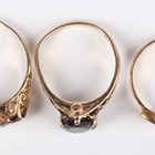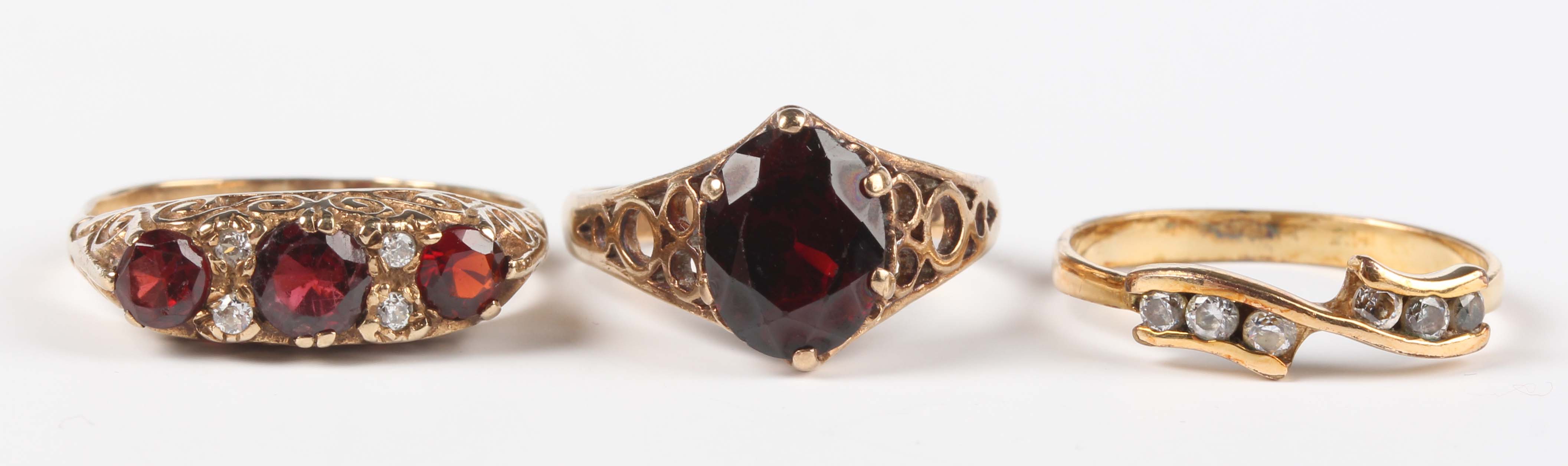 A 9ct gold ring, mounted with three circular cut garnets alternating with two pairs of colourless gemstones, Birmingham 1987, ring size approx O, a 9ct gold ring, claw set with an oval cut garnet, ring size approx J, total weight 4.6g, and a colourless gem set costume ring.