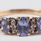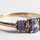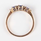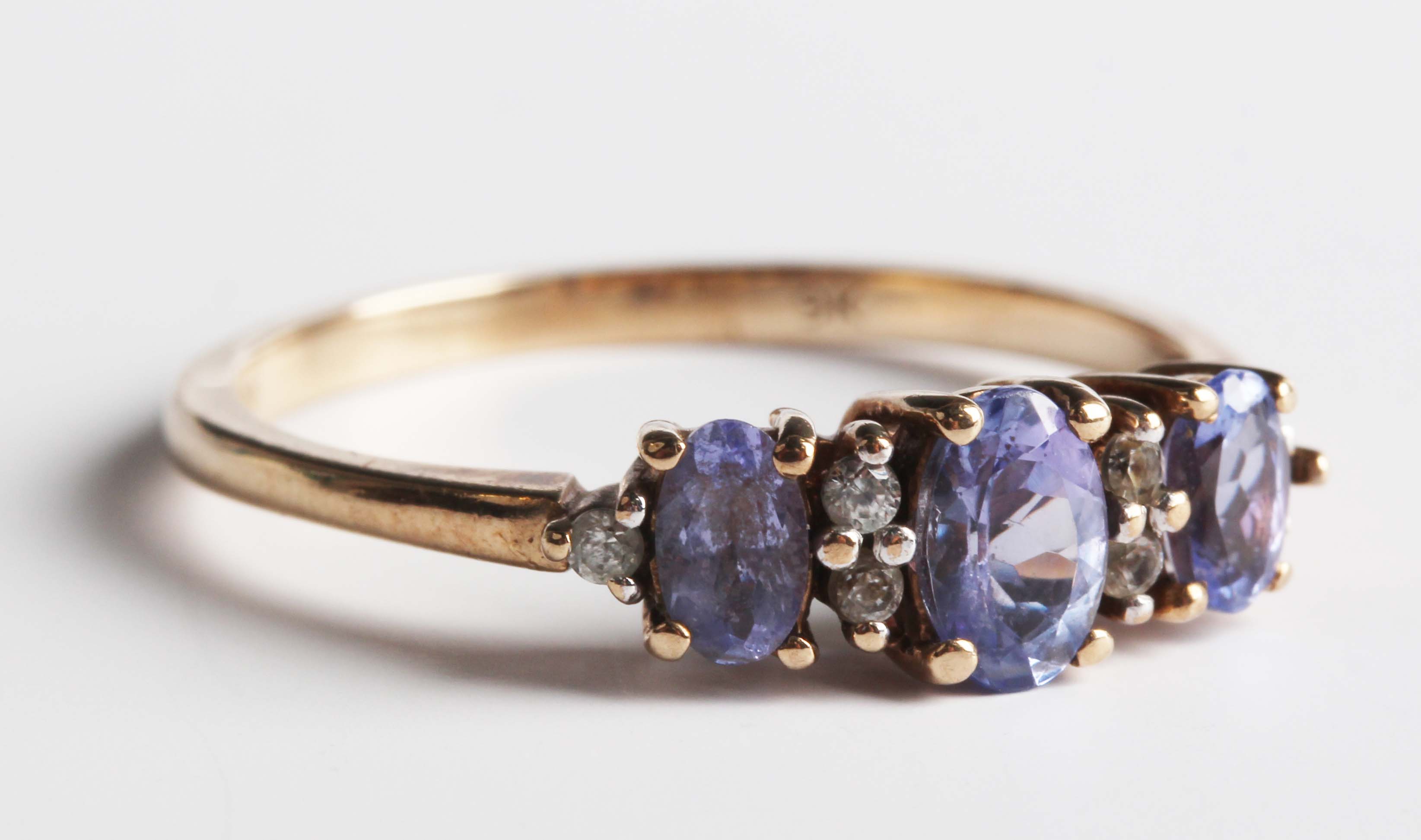 A 9ct gold, tanzanite and colourless gem set ring, claw set with a row of three graduated oval cut tanzanites with colourless gemstones mounted at intervals, weight 2.3g, ring size approx S1/2 (one colourless gemstone lacking).