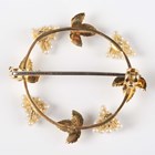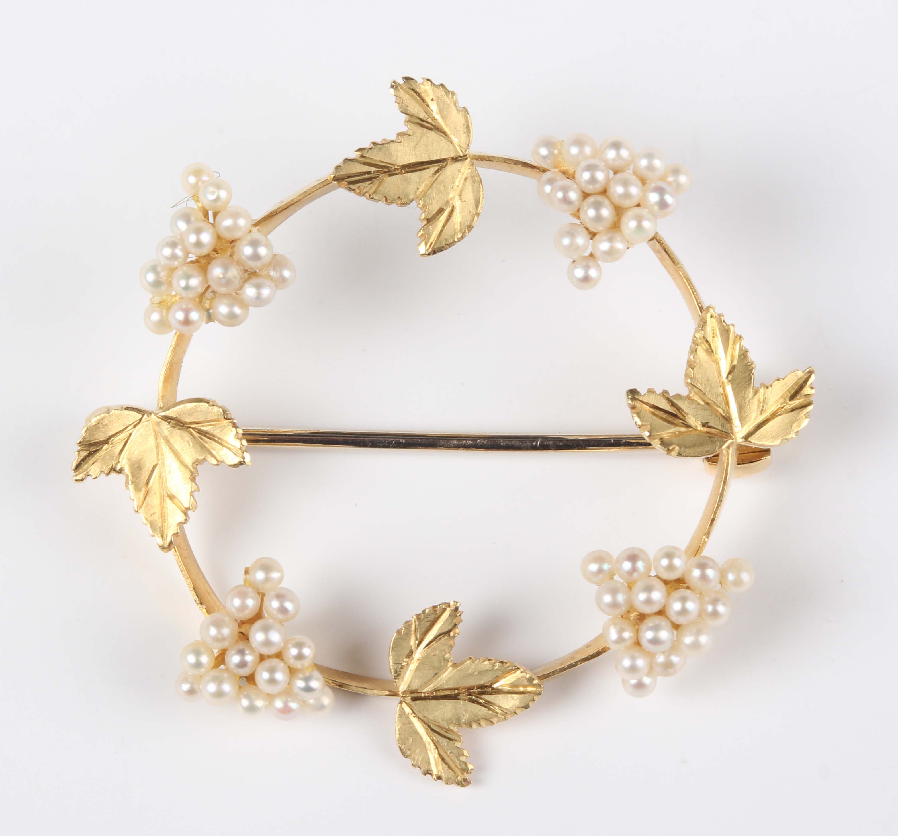 A gold and seed pearl shaped circular brooch in a fruiting vine design, mounted with four clusters of seed pearls alternating with leaf motifs, unmarked, weight 3g, width 3.1cm.