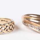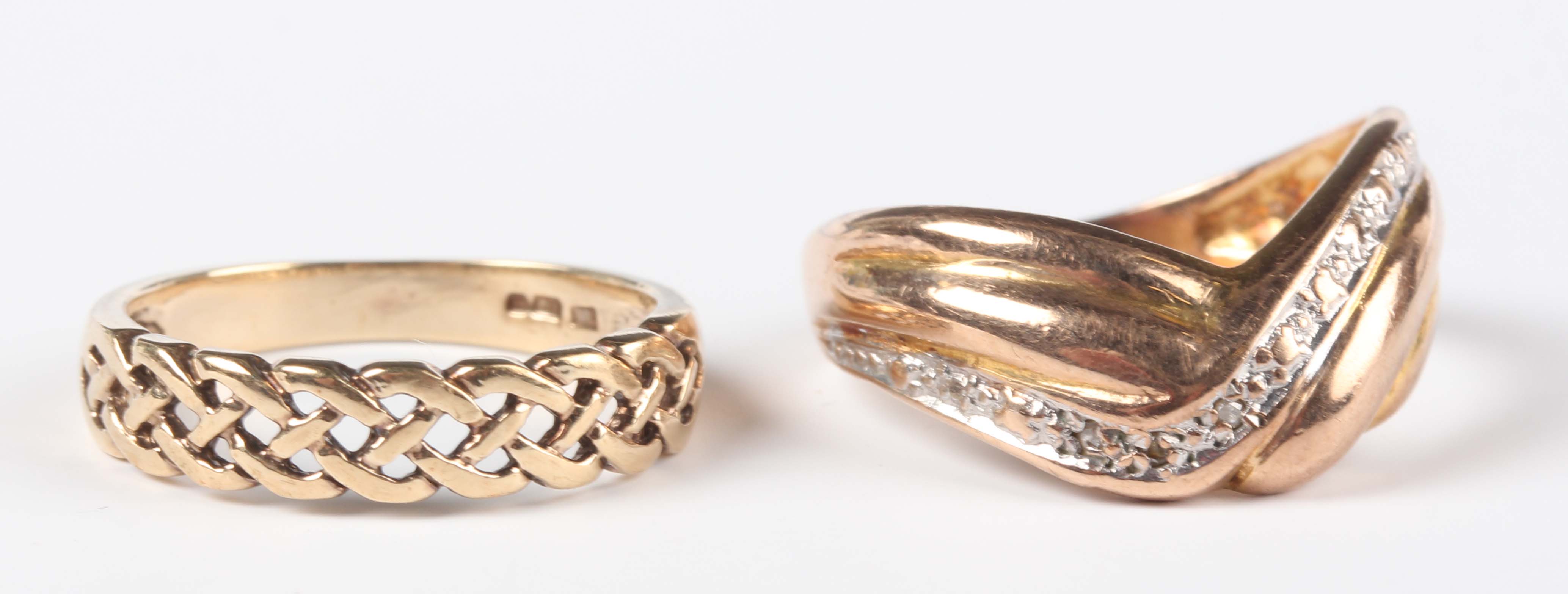 A 9ct gold ring in a 'V' shaped ridged design, mounted with three diamonds, import mark Birmingham 1989, ring size approx O, and a 9ct gold ring in an interwoven design, ring size approx L1/2, total weight 4.8g.