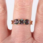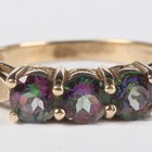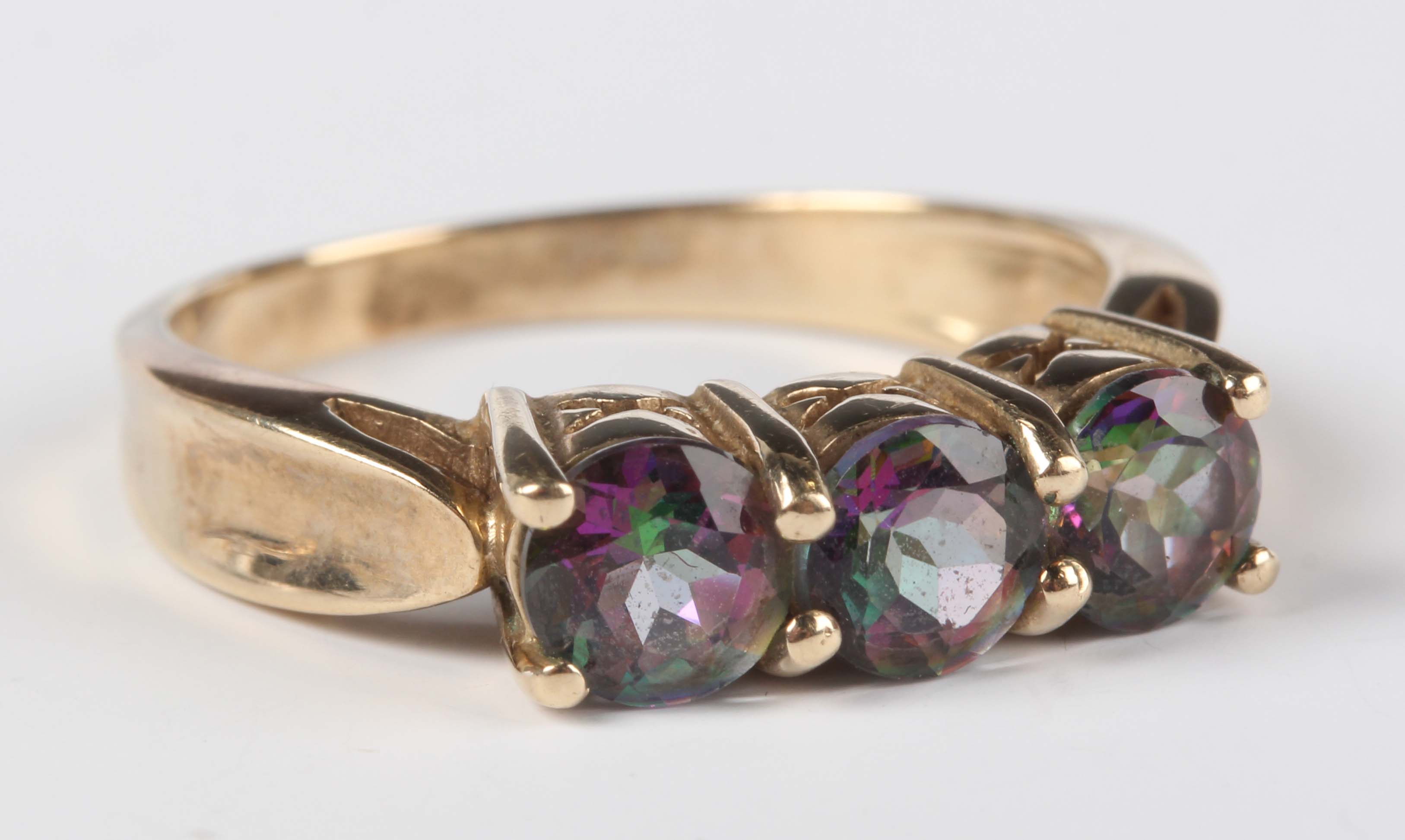 A gold ring, claw set with a row of three circular cut mystic topazes, unmarked, weight 3.6g, ring size approx Q1/2.