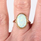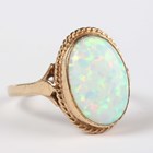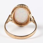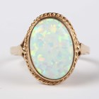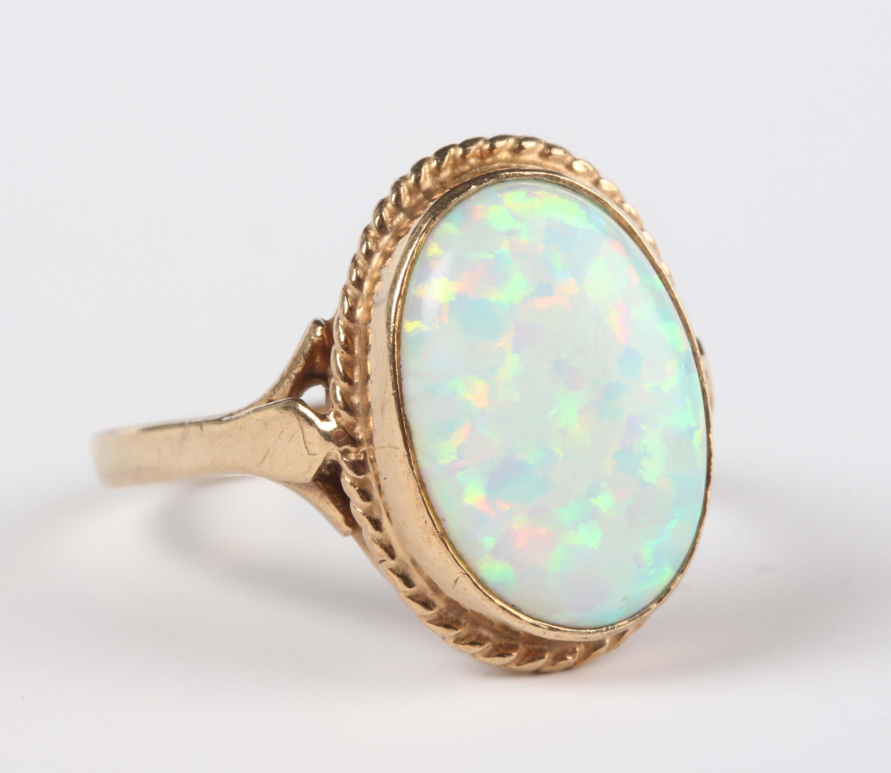 A 9ct gold ring, collet set with an oval synthetic opal within a ropetwist border, weight 3.1g, ring size approx O1/2.
