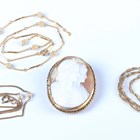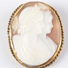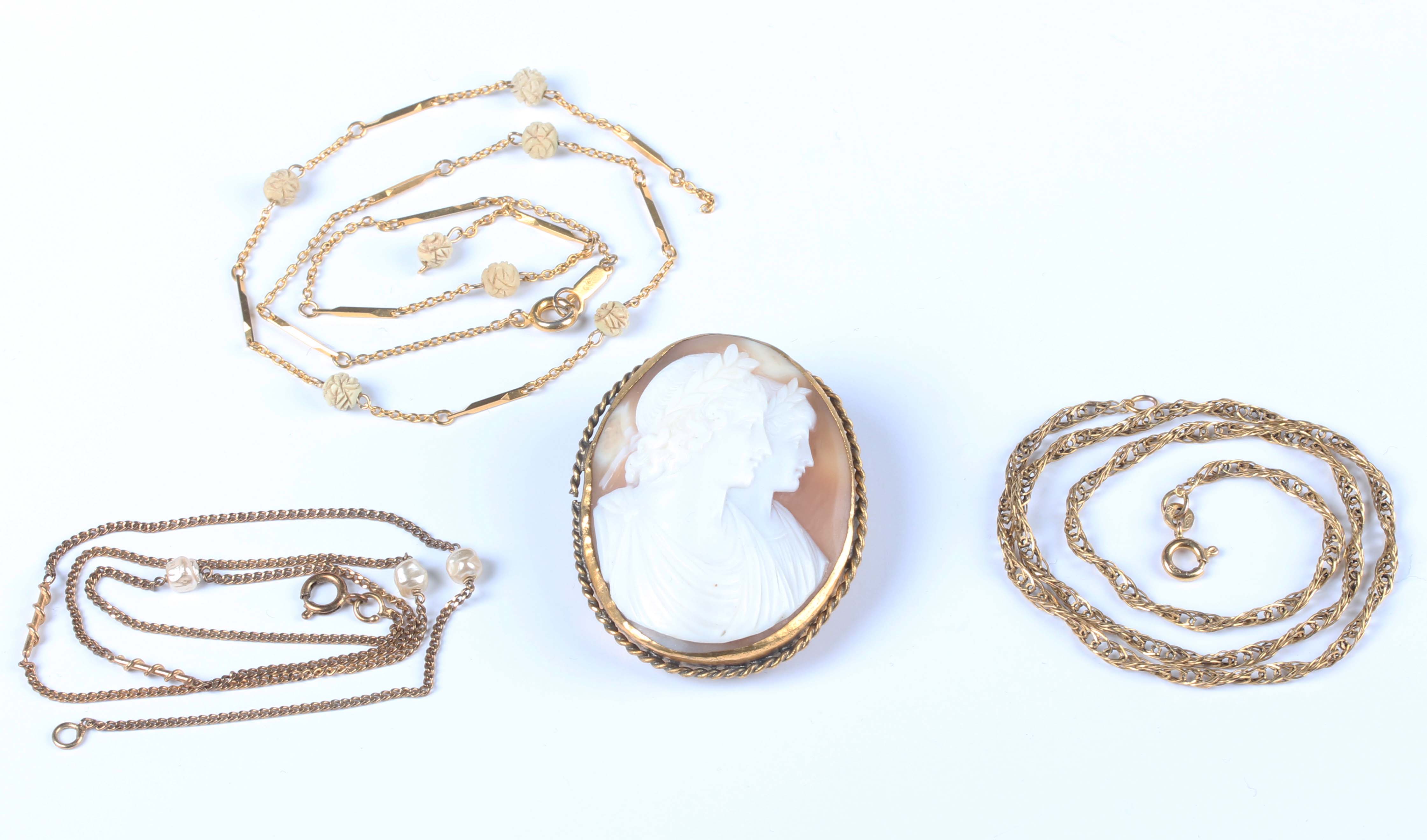 A 9ct gold twist link neckchain on a boltring clasp, weight 2.9g, length 39.5cm, a Victorian gilt metal oval shell cameo brooch, carved as the busts of two classical women, unmarked, width 3.7cm, together with two gilt metal neckchains, one mounted with imitation pearls, the other with carved bone beads.