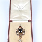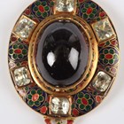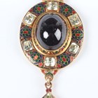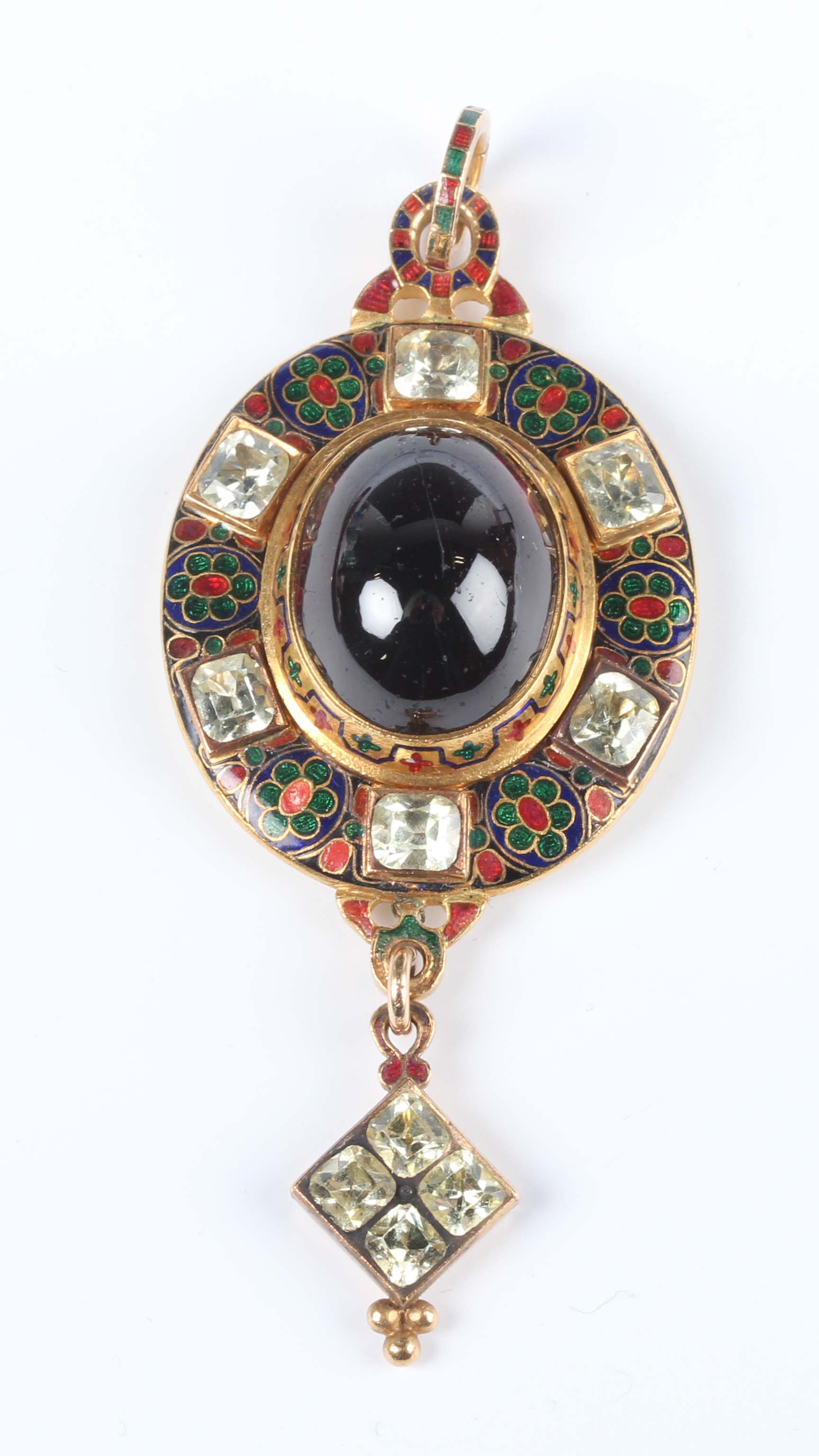 A Victorian gold, carbuncle garnet, foil backed chrysoberyl and enamelled oval pendant locket in the Holbeinesque taste, the back glazed with an oval locket compartment, otherwise with engraved decoration, unmarked, weight 18.2g, length 6.8cm, with a fitted case.