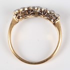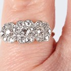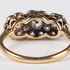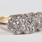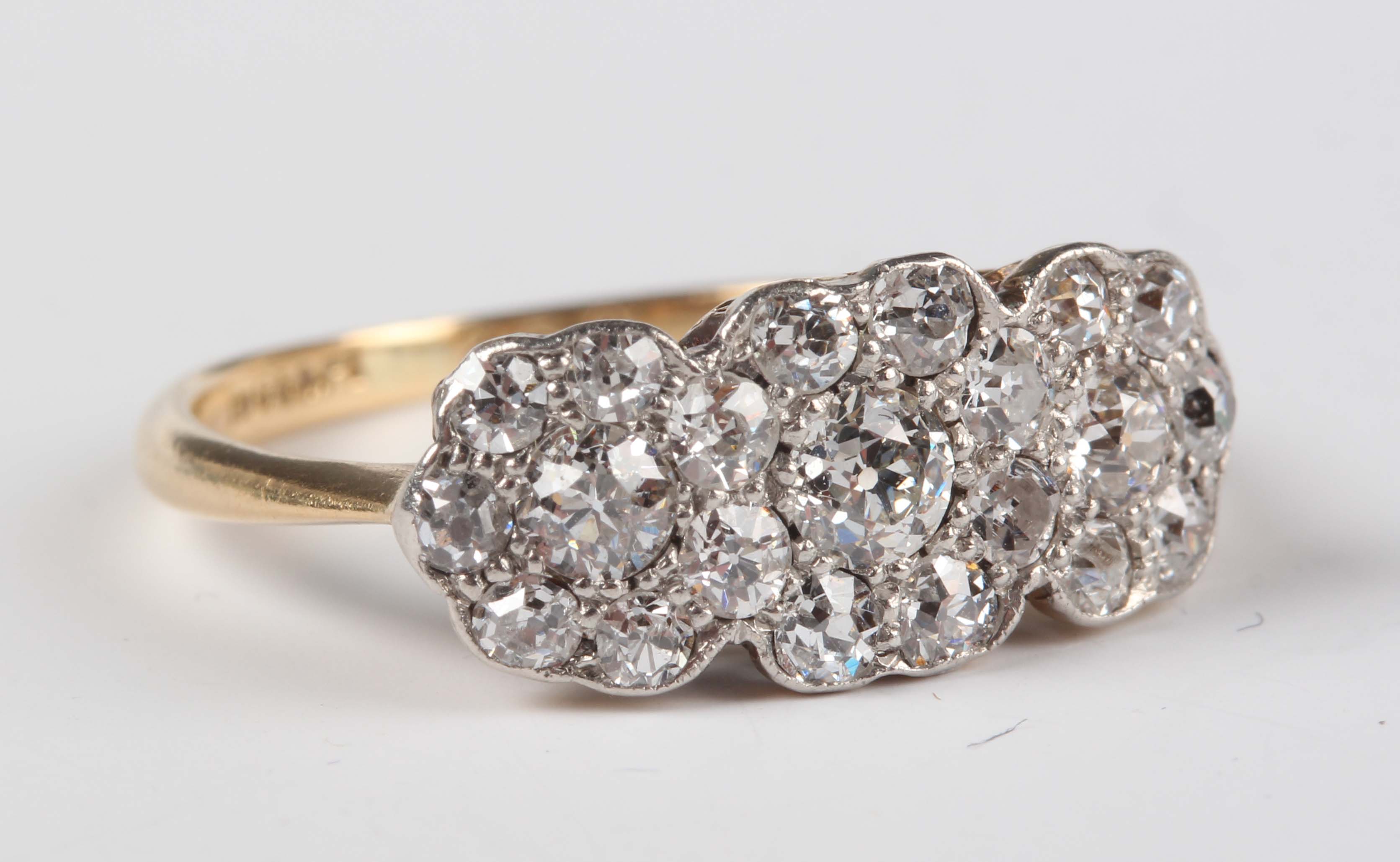 A gold, platinum and diamond ring in a triple cluster design, mounted with cushion shaped diamonds, detailed ‘18ct&Pl’, weight 2.1g, ring size approx I1/2, with a case.