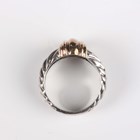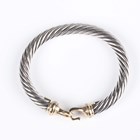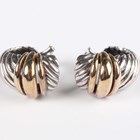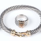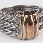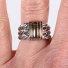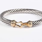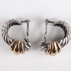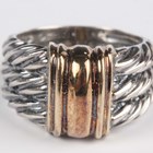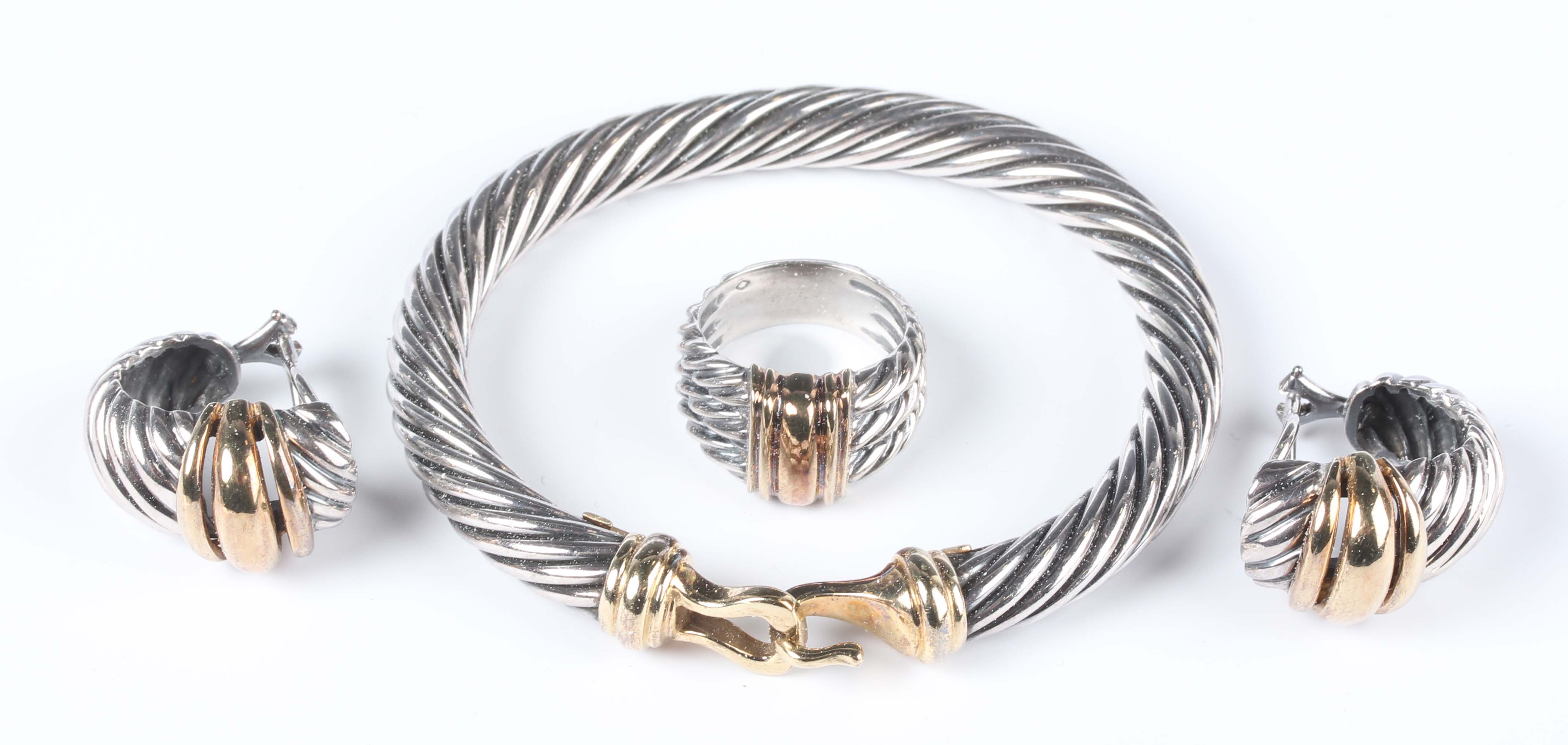A group of David Yurman silver and gold jewellery, comprising a cable bangle, detailed ‘DY 925 14K’, inside width 5.5cm, a pair of earclips with tapered spiral ropetwist decoration, detailed ‘D YURMAN 14K 925’, length 2.7cm, and a ring in a three row ropetwist design with a central ridged saddle form motif, detailed ‘D YURMAN STG 14K’, ring size approx M, total weight 71.8g, with three David Yurman pouches.