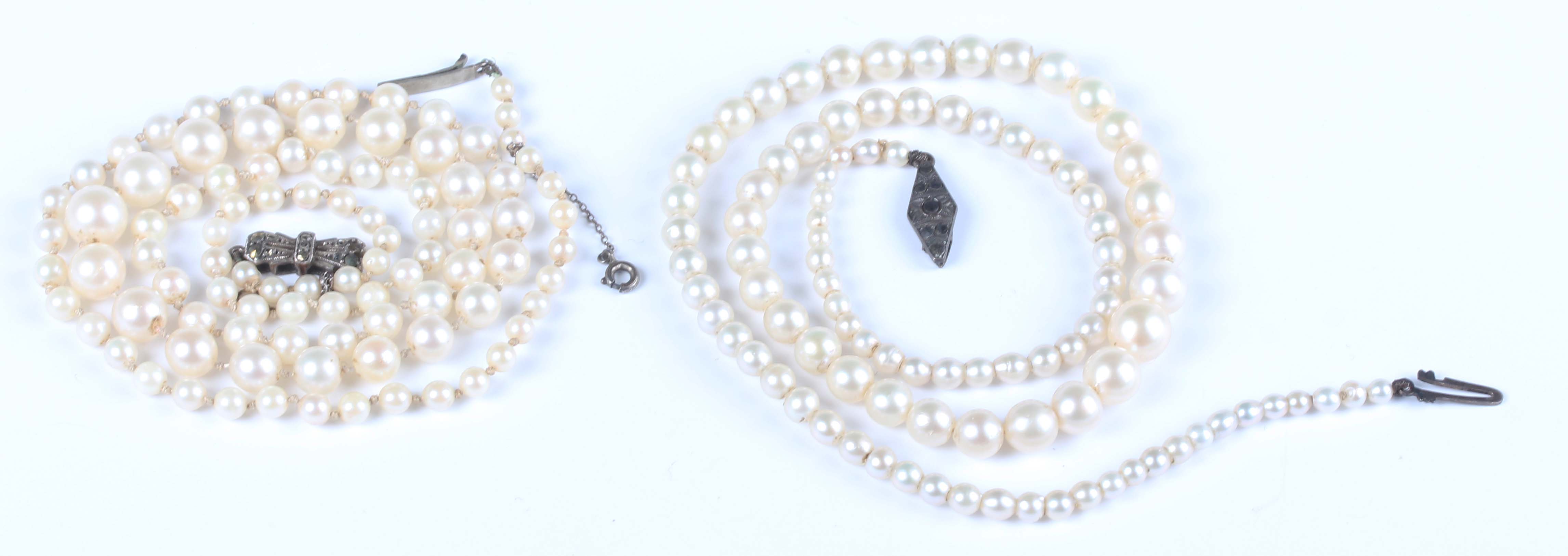 Two single row necklaces of graduated cultured pearls, each with a silver and marcasite clasp, lengths 44.5cm and 56cm.