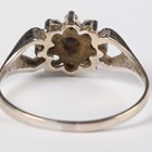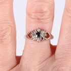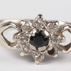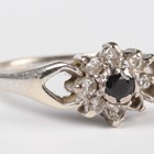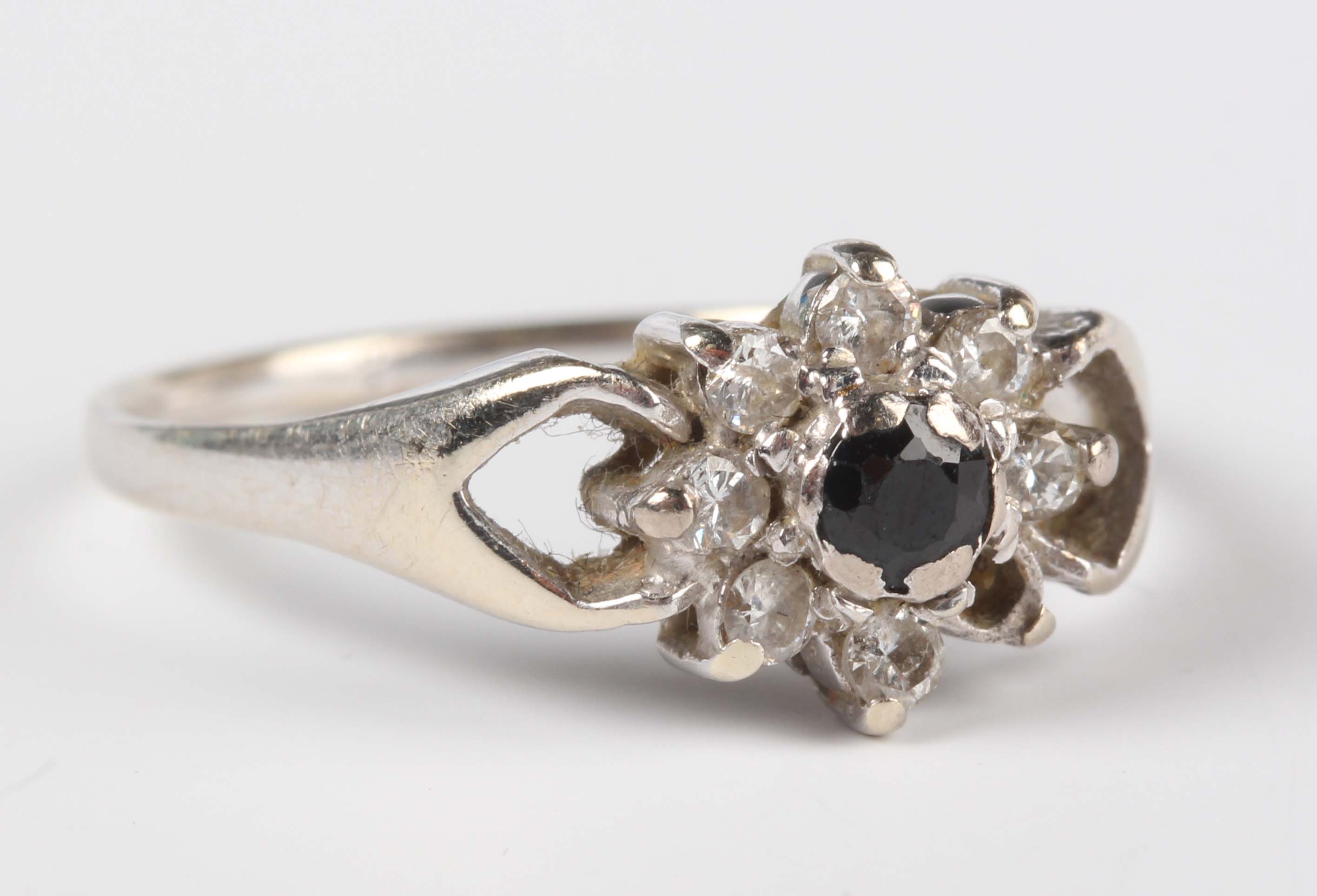 A white gold, sapphire and diamond cluster ring with 'V' shaped shoulders, unmarked, weight 2.5g, ring size approx O1/2 (one diamond lacking).