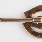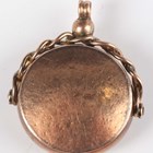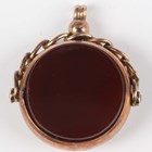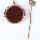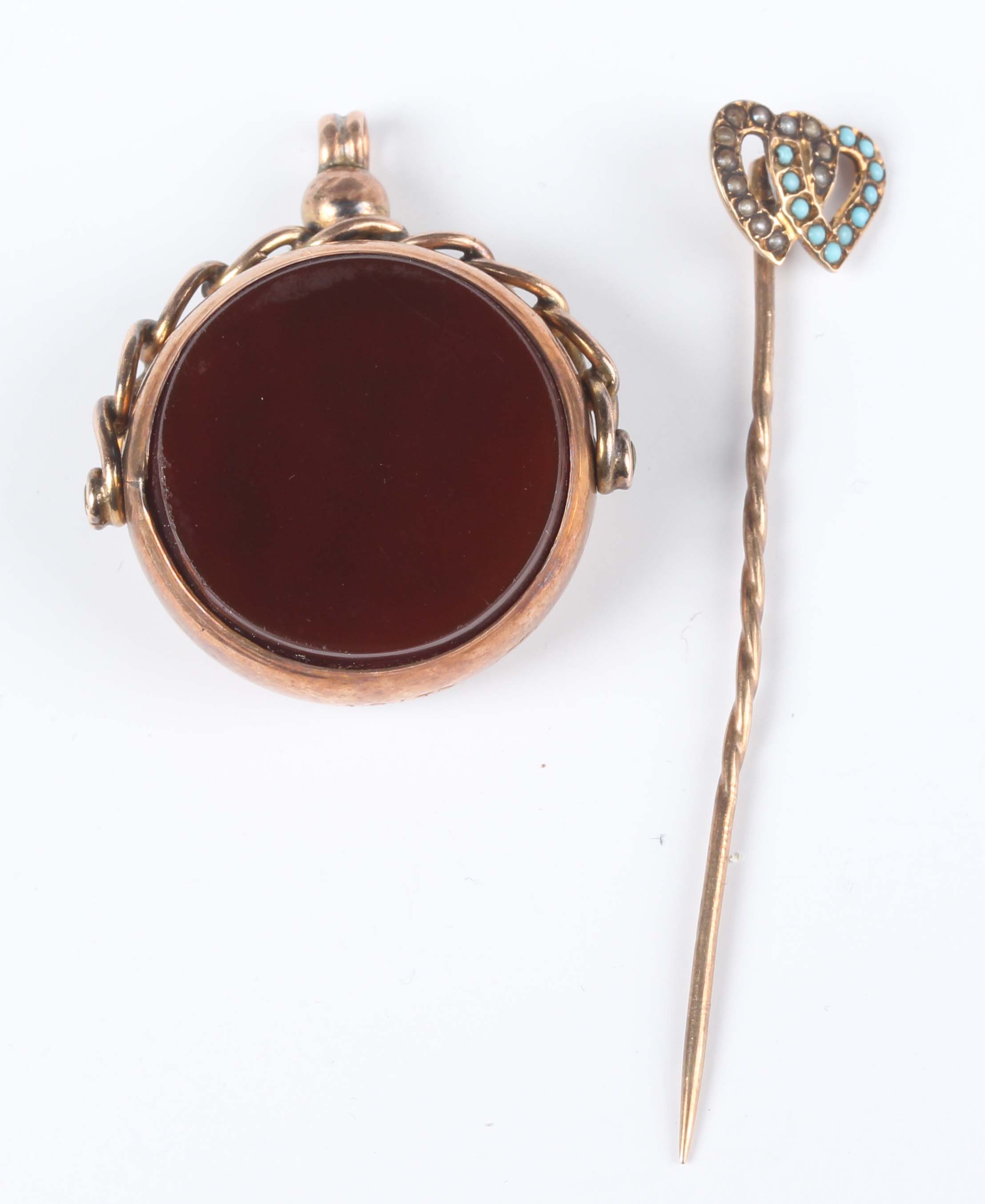 A gold and chalcedony circular rotating pendant fob, detailed ‘9C’, weight 9.2g, length 3.2cm, and a seed pearl and imitation turquoise stickpin, the finial designed as two intertwined hearts, unmarked.