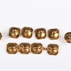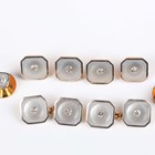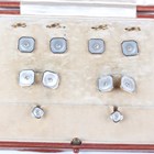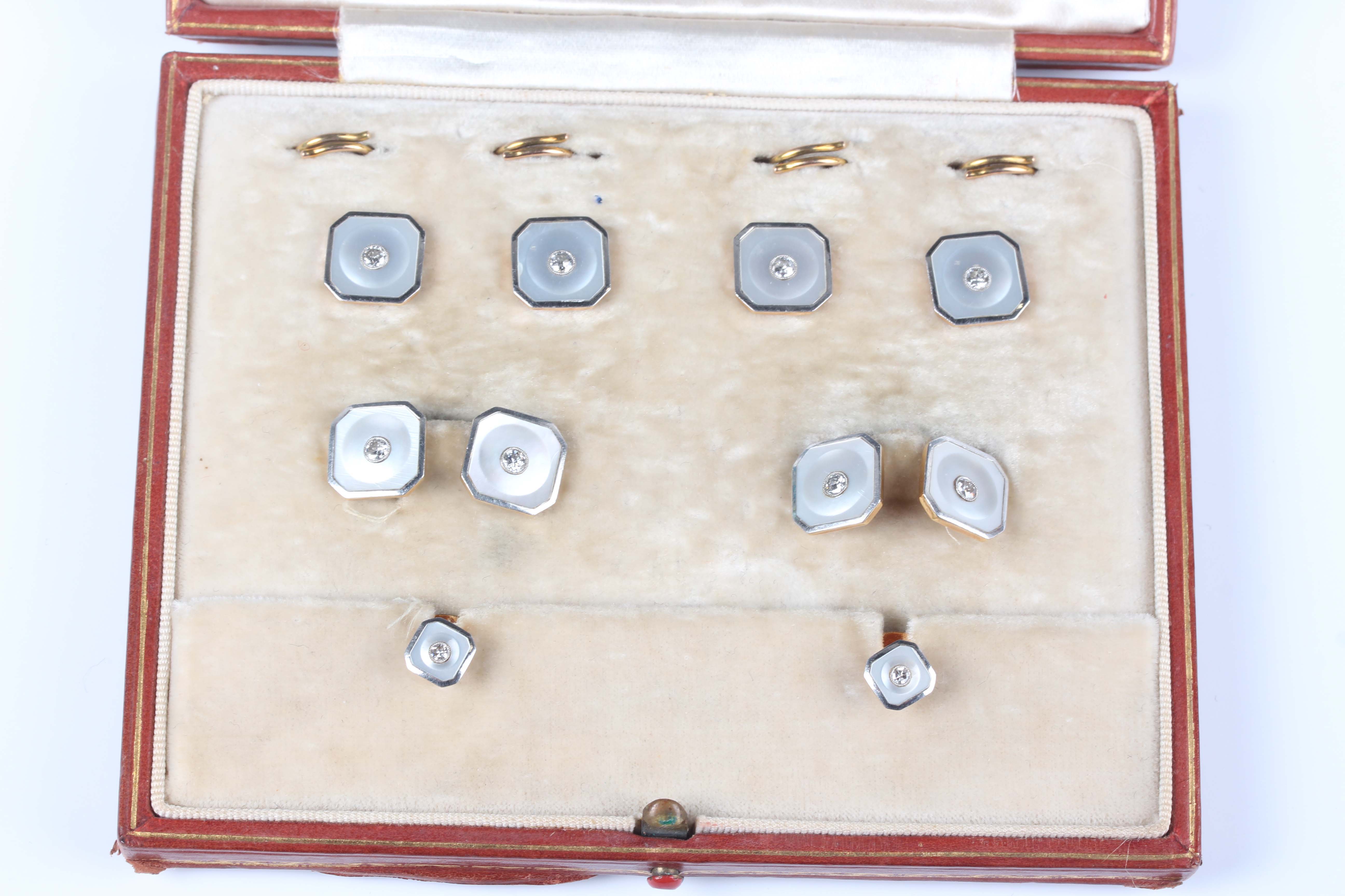 A gold, platinum, mother-of-pearl and diamond evening dress set, comprising a pair of studs, a pair of cufflinks and four buttons, each of square form with canted corners, detailed ‘18ct Platinum 229’, total weight 10.6g, dimensions of each cufflink front 1.1cm x 1.1cm, cased.