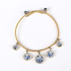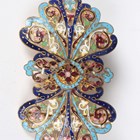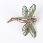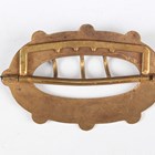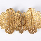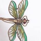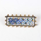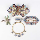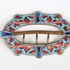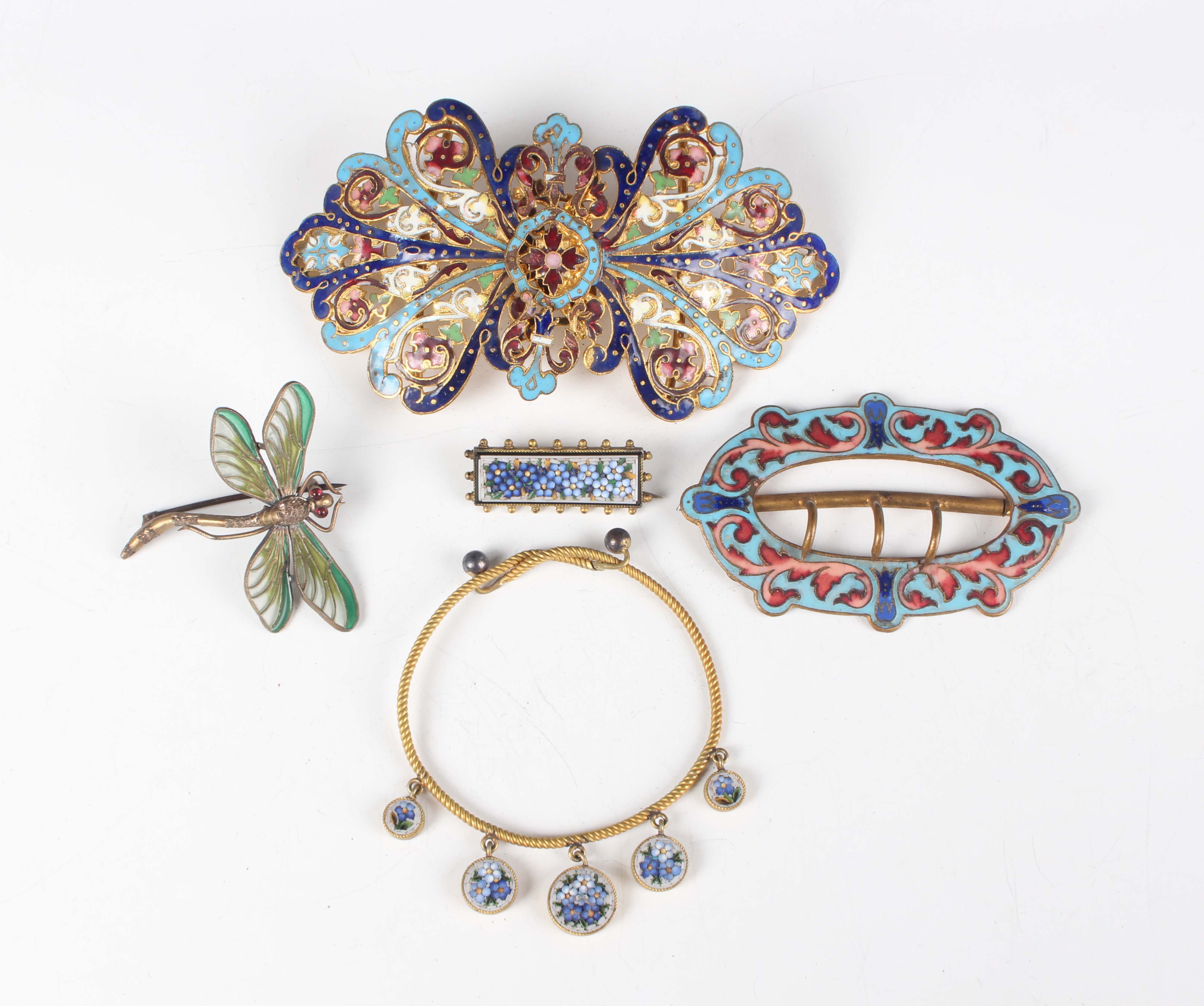 A gilt metal and micromosaic two piece set, comprising a bracelet, mounted with five graduated circular panels decorated with flowers, detailed ‘BG’, inside width 5.2cm, and a matching rectangular brooch, detailed ‘BG’, width 3.4cm, with a case, together with a gilt metal and enamelled two piece waistbelt buckle, another similar enamelled buckle and a dragonfly brooch.