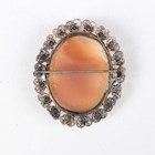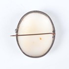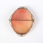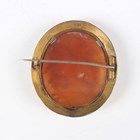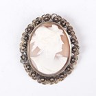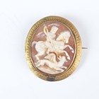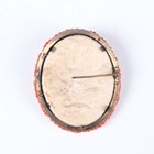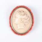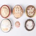 A gilt metal mounted oval shell cameo brooch, carved as St George slaying the dragon, width 4.4cm, a lava cameo brooch, carved as a portrait of a lady within a coral bead border, three further cameo brooches and an unmounted cameo, carved as the Three Graces.