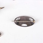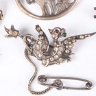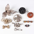 A Charles Horner silver and enamelled oval brooch, decorated with pink roses, Chester 1921, width 2.5cm, a Mexican sterling silver brooch, total weight 14.1g, a white metal and colourless paste brooch, designed as a dragon, unmarked, three filigree brooches, a Victorian jet circular brooch and two further brooches.