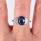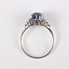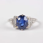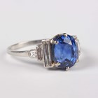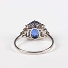 A platinum, Ceylon sapphire and diamond ring, mounted with the oval mixed cut Ceylon sapphire between baguette cut diamond stepped shoulders, detailed ‘Platinum’, weight 5g, sapphire weight approx 4.40ct, ring size approx U, with a European Diamond & Gemstone Jewellery Report.