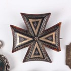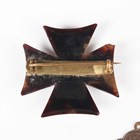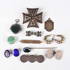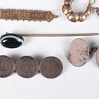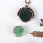 A small group of jewellery, including a Victorian piqué tortoiseshell brooch, designed as a Maltese cross, width 4.1cm, a silver mounted bloodstone and cornelian rotating pendant fob, Birmingham 1900, a banded agate stickpin and a pair of hoop shaped earrings.