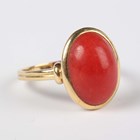 A gold ring, collet set with an oval cabochon coral ring, detailed ‘750’, weight 5.7g, ring size approx T.