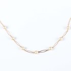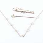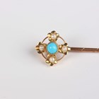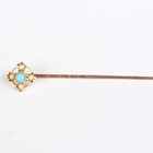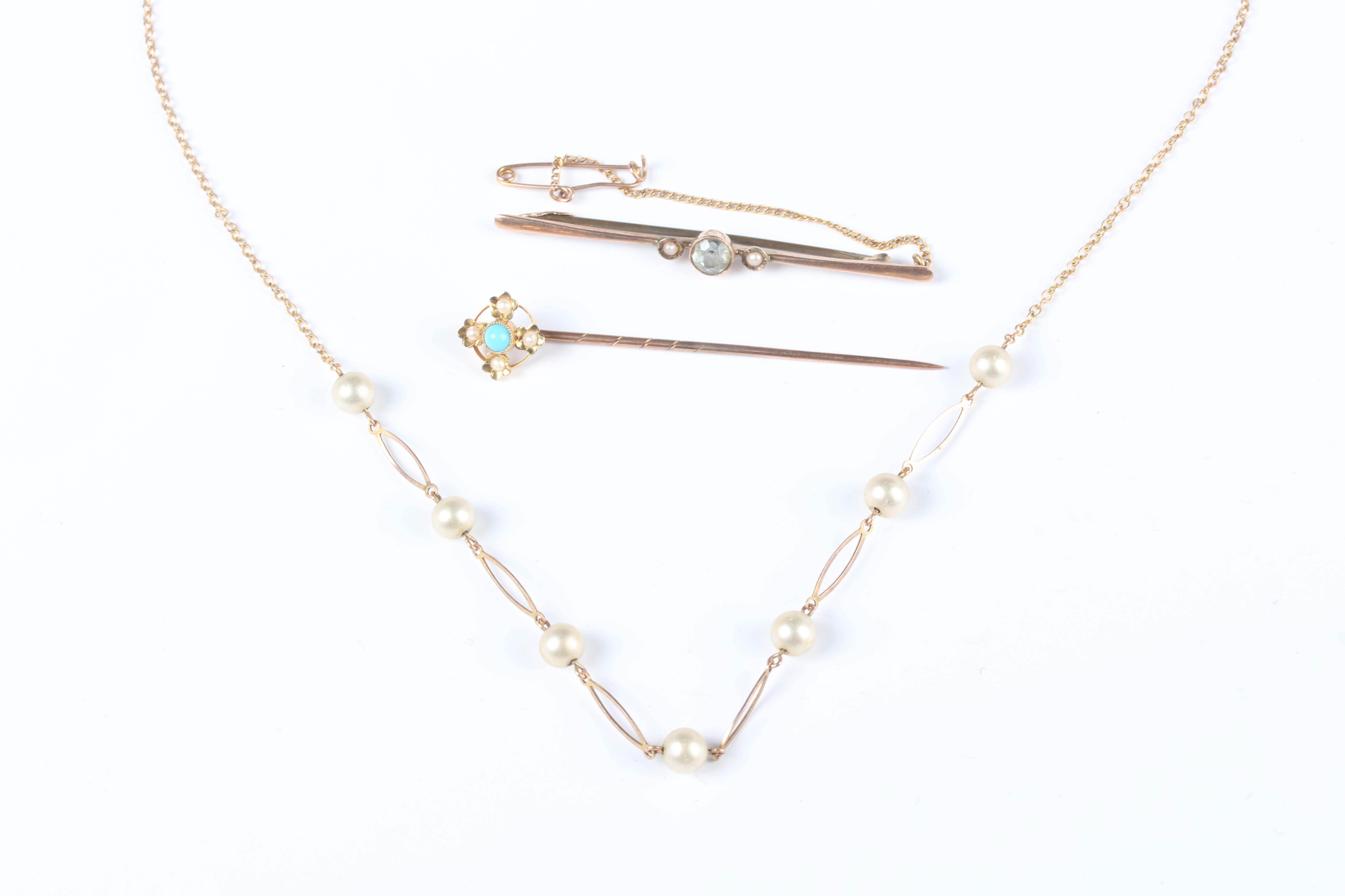 A gold topped, turquoise and seed pearl stickpin, detailed ‘15ct’, a gold, seed pearl and aquamarine bar brooch, detailed ‘9ct’, weight 1.7g and a gold and imitation pearl necklace on a boltring clasp, detailed ‘9ct’, weight 2.7g.