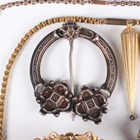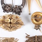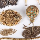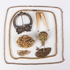 A group of Victorian gilt metal jewellery, comprising an Etruscan style brooch, mounted with turquoises, width 2.6cm, a pair of earring drops and four necklaces, together with a Victorian Celtic Tara style brooch, unmarked.