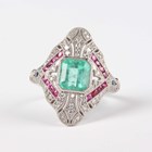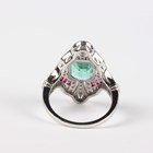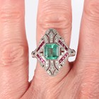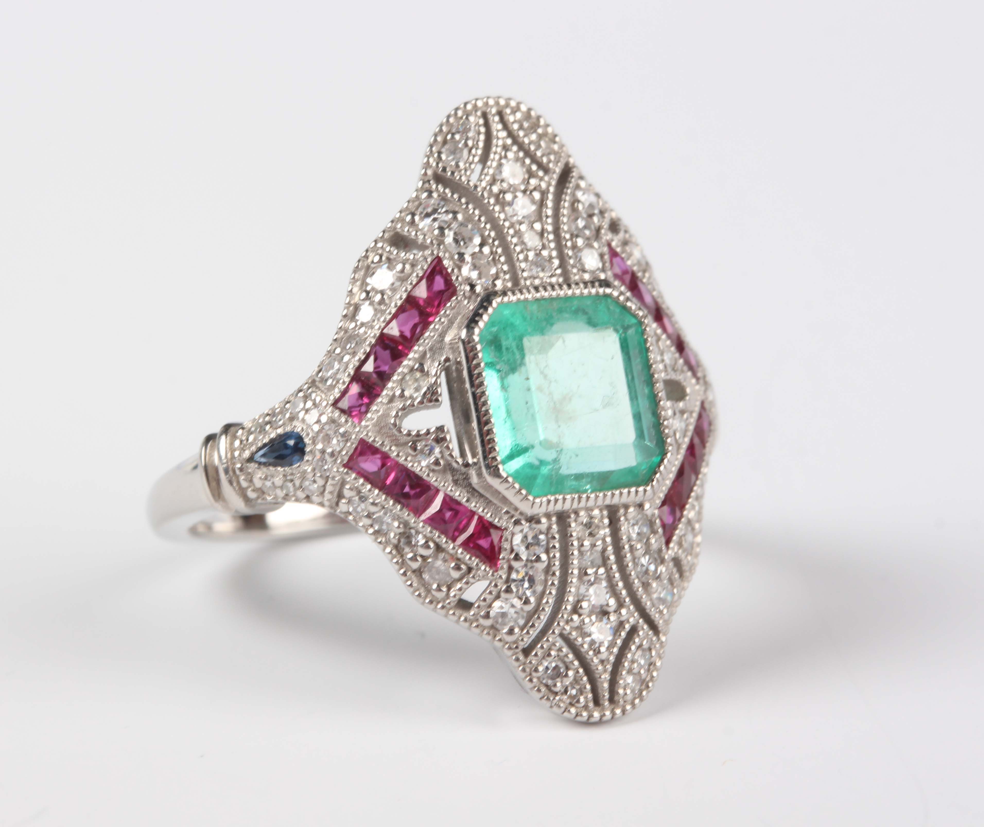 A platinum, emerald, ruby, sapphire and diamond panel shaped ring, mounted with an octagonal cut emerald within a surround of variously cut rubies and circular cut diamonds, weight 8.7g, emerald weight approx 2.00ct, total diamond weight approx 0.50ct, ring size approx N1/2.