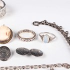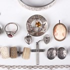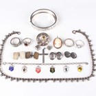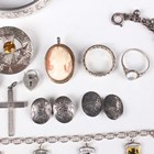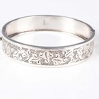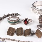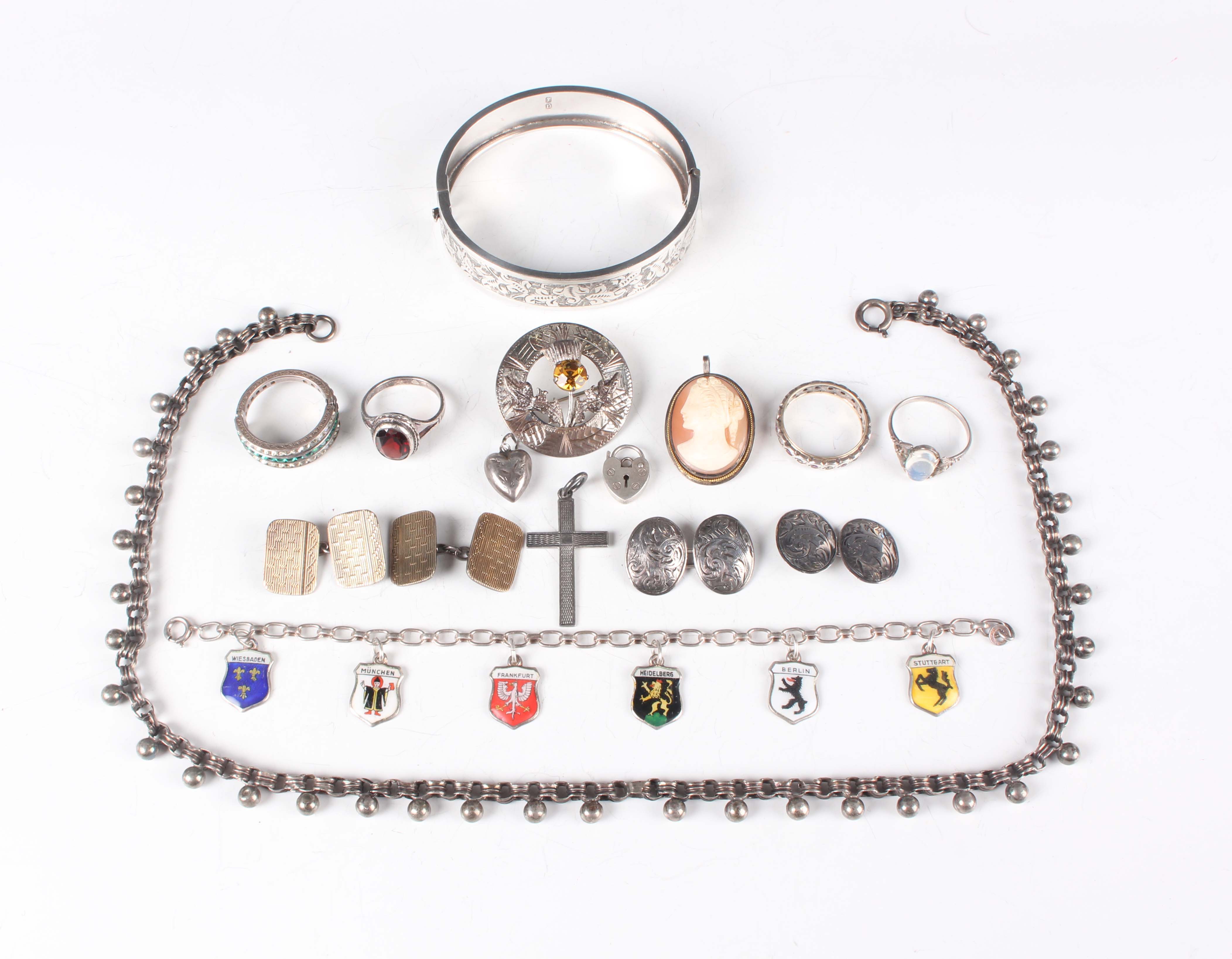 A group of silver and silver mounted jewellery, including a Victorian oval hinged bangle with engraved decoration, Chester 1887, inside width 5.4cm, a pair of Victorian oval cufflinks, Birmingham 1886, a necklace, detailed ‘Sterling’, a Scottish yellow paste brooch, a bracelet with enamelled shield shaped town crest charms, and a pair of gold fronted on silver rectangular cufflinks, total weight 70.4g.