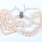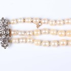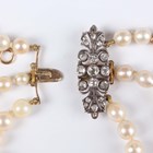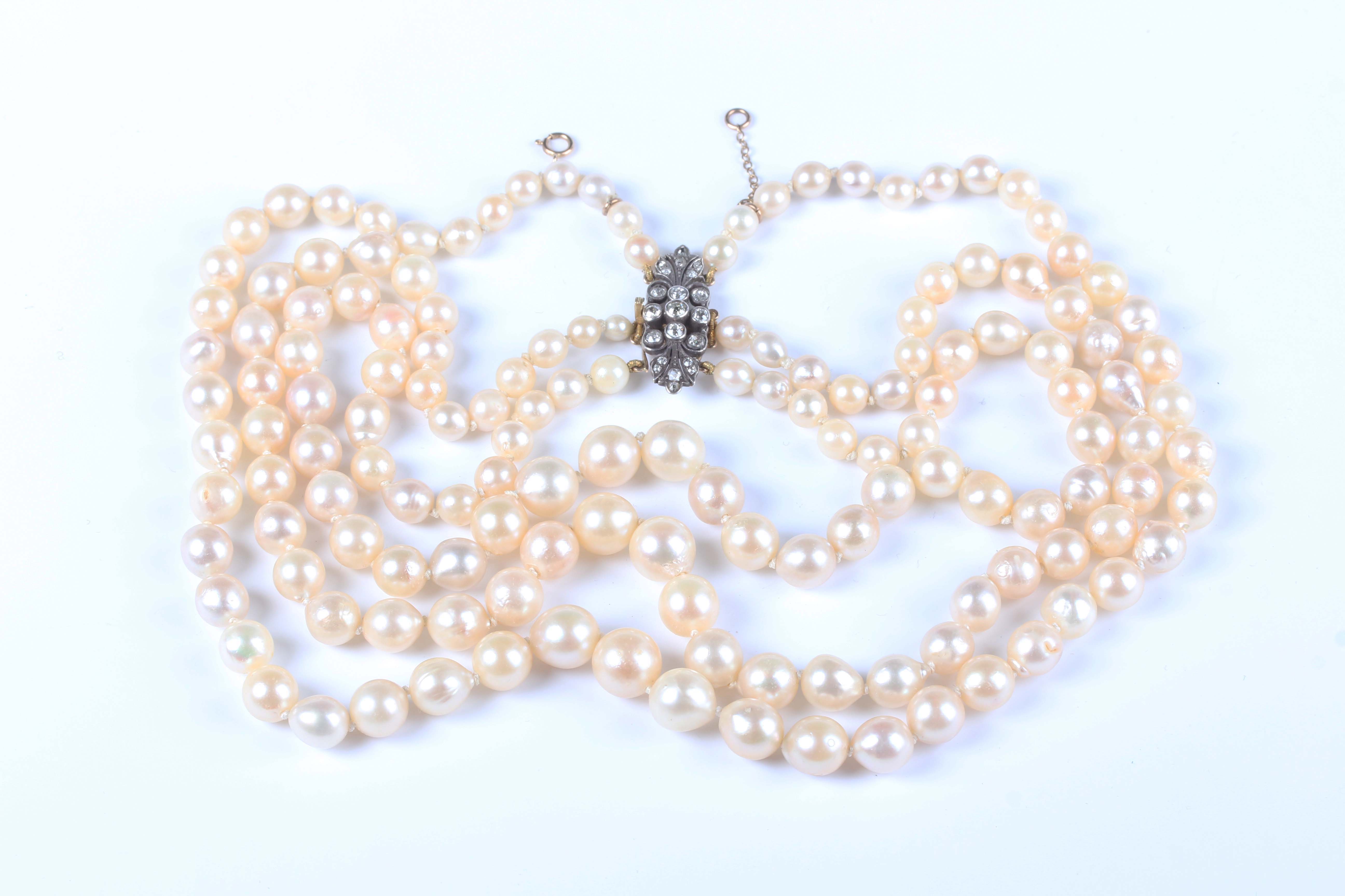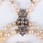 A three row necklace of graduated cultured pearls on a gold backed, silver set and diamond foliate clasp, unmarked, length of shortest strand 37cm.