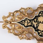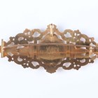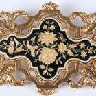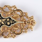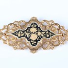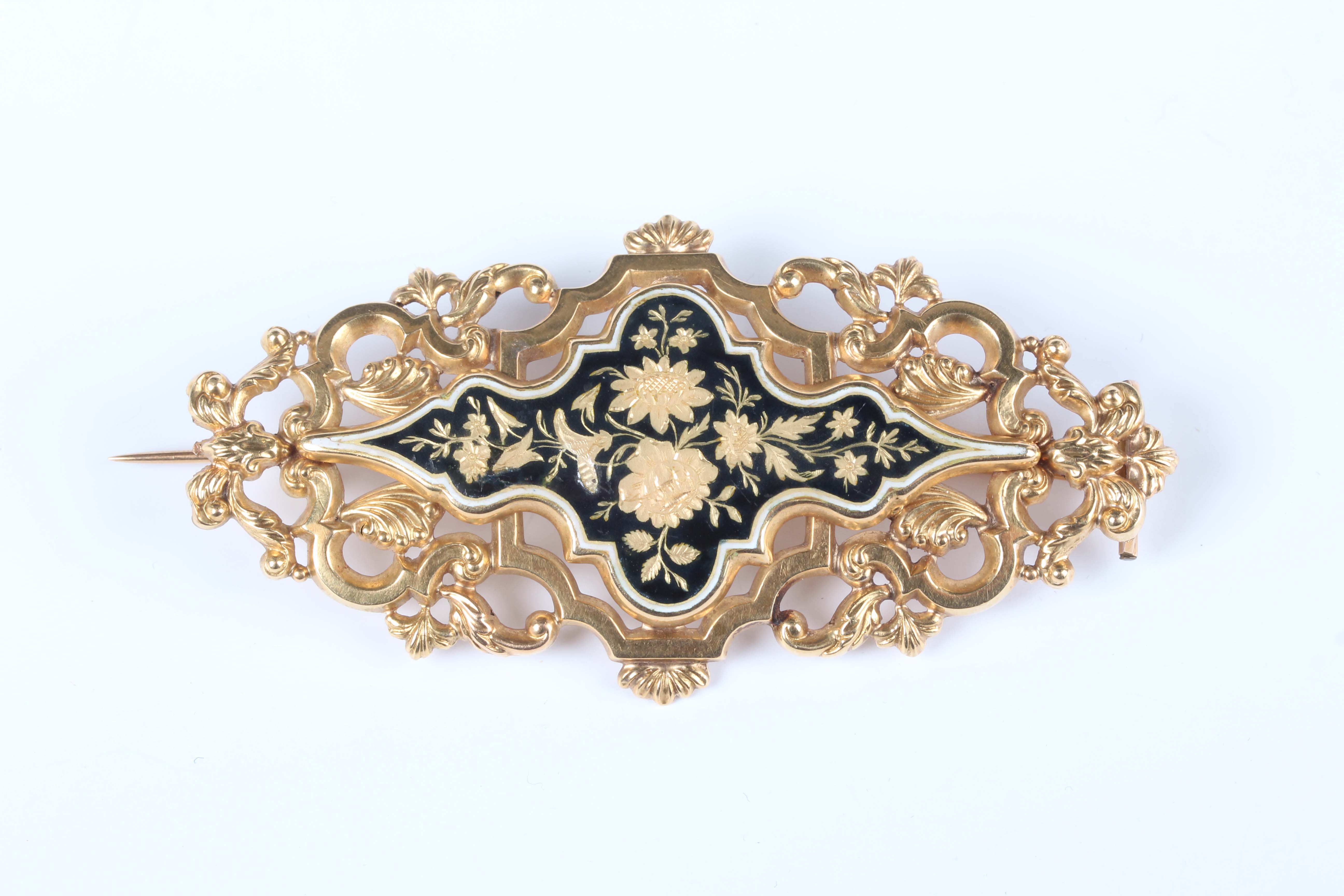A Continental gold and enamelled brooch, 19th century, of shaped oval openwork form, the centre with gilt floral and foliate decoration on a black enamelled ground within a white enamelled border, unmarked, weight 15.6g, width 8.5cm.