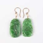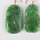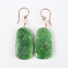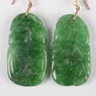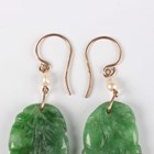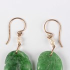 A pair of 9ct gold mounted, freshwater cultured pearl and jade pendant earrings, each jade carved with fruit, length 5.2cm.