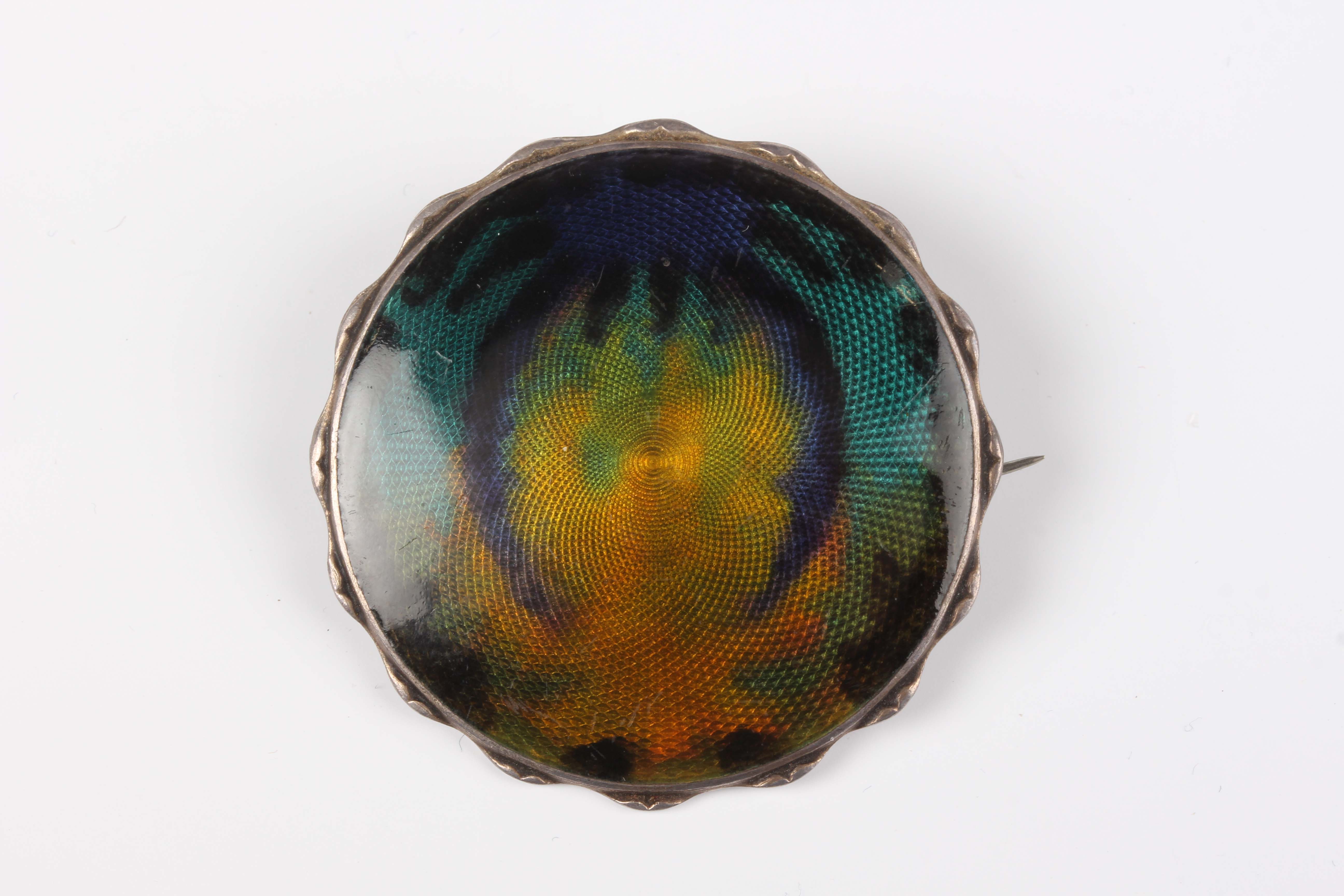 A Scandinavian silver and varicoloured enamelled shaped circular brooch of abstract design, detailed ‘925 S’, weight 18.1g, diameter 4.4cm.