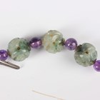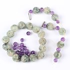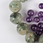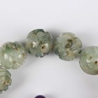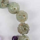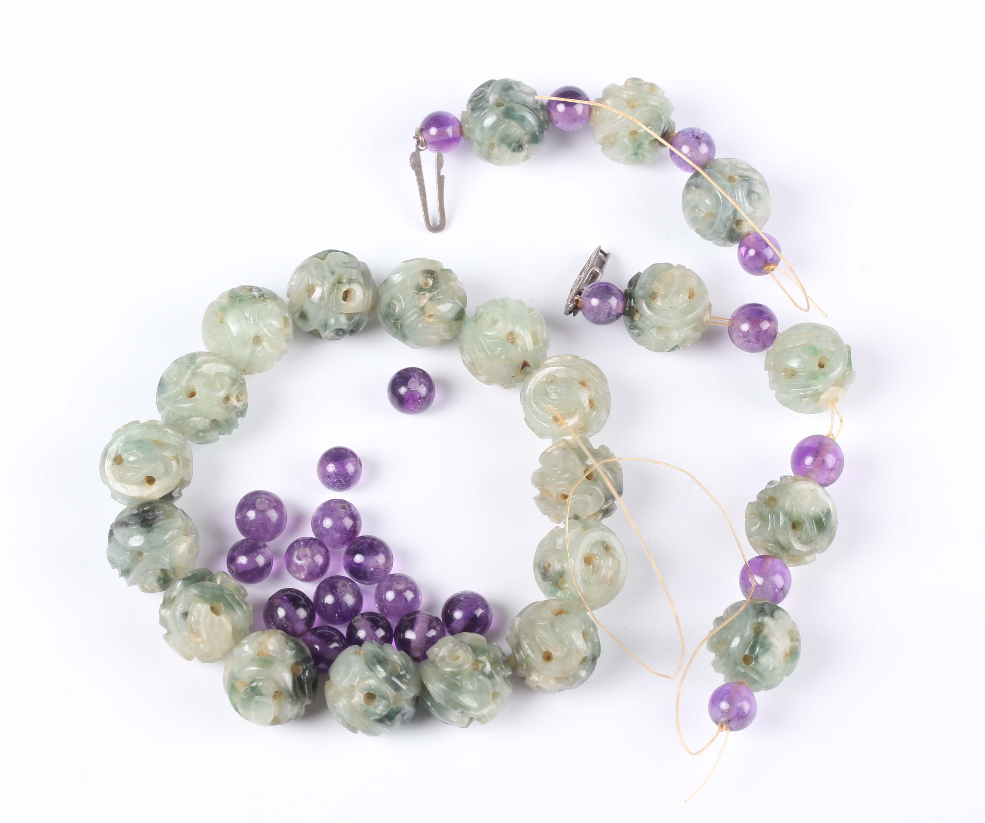 A single row necklace of jade and amethyst quartz beads, the jade beads with carved and pierced decoration, diameter of each jade bead 1.2cm (the thread broken).