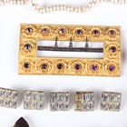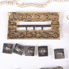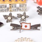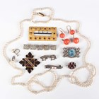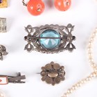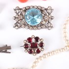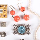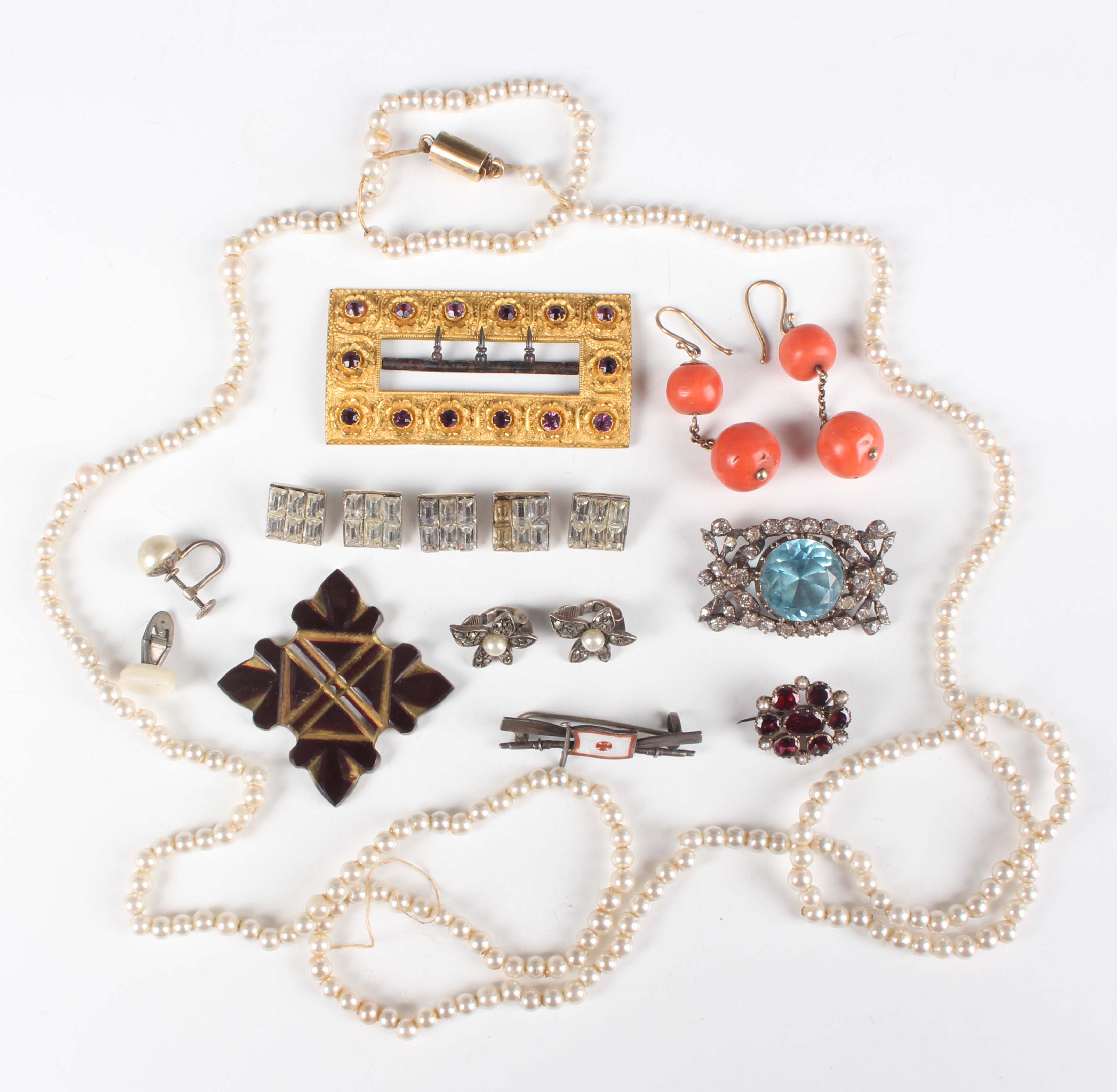 A small group of jewellery, including a pair of coral pendant earrings with wire fittings, length 4.8cm, a 19th century foil backed garnet and seed pearl brooch, a single row necklace of imitation pearls on a gold cylindrical clasp, unmarked, and a blue and colourless paste set brooch, unmarked.