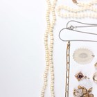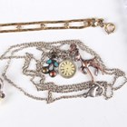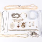 A two row necklace of graduated cultured pearls on a gold and cultured pearl clasp, detailed ‘9ct’, length of shortest strand 45cm, a single row necklace of cultured pearls on a white gold clasp, detailed ‘585’, length 43cm, a single row necklace of cultured pearls on a gold clasp, detailed ‘14K’, length 55.5cm, and a small group of costume jewellery.