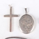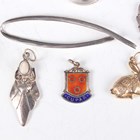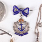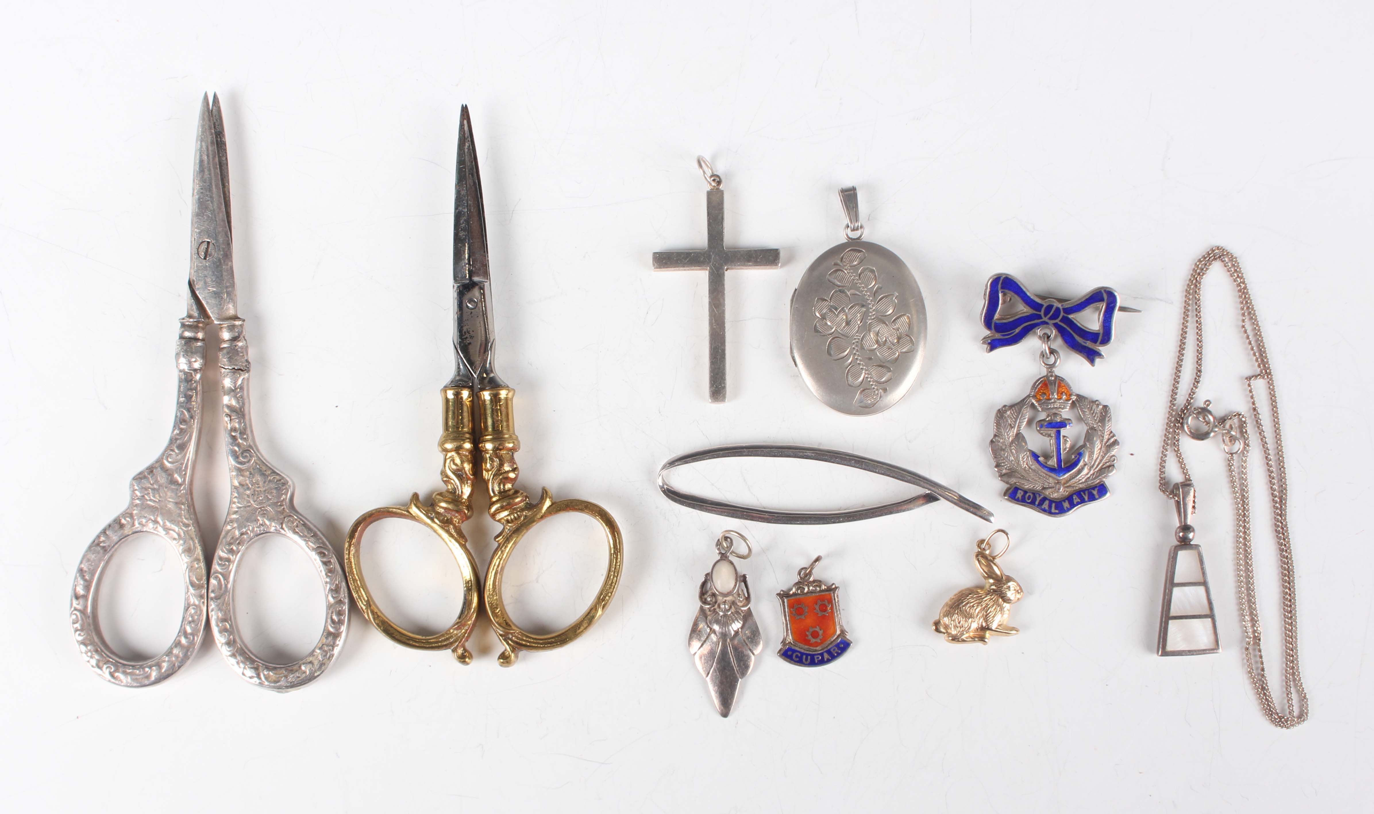 A gold rabbit pendant, unmarked, weight 0.7g, length 2cm, five silver pendants and charms, a silver neckchain, a silver and enamelled Royal Navy brooch, total weight 23.1g, a white metal pendant cross, unmarked, a pair of sterling silver mounted scissors and a pair of brass mounted scissors.