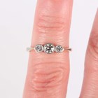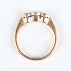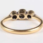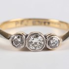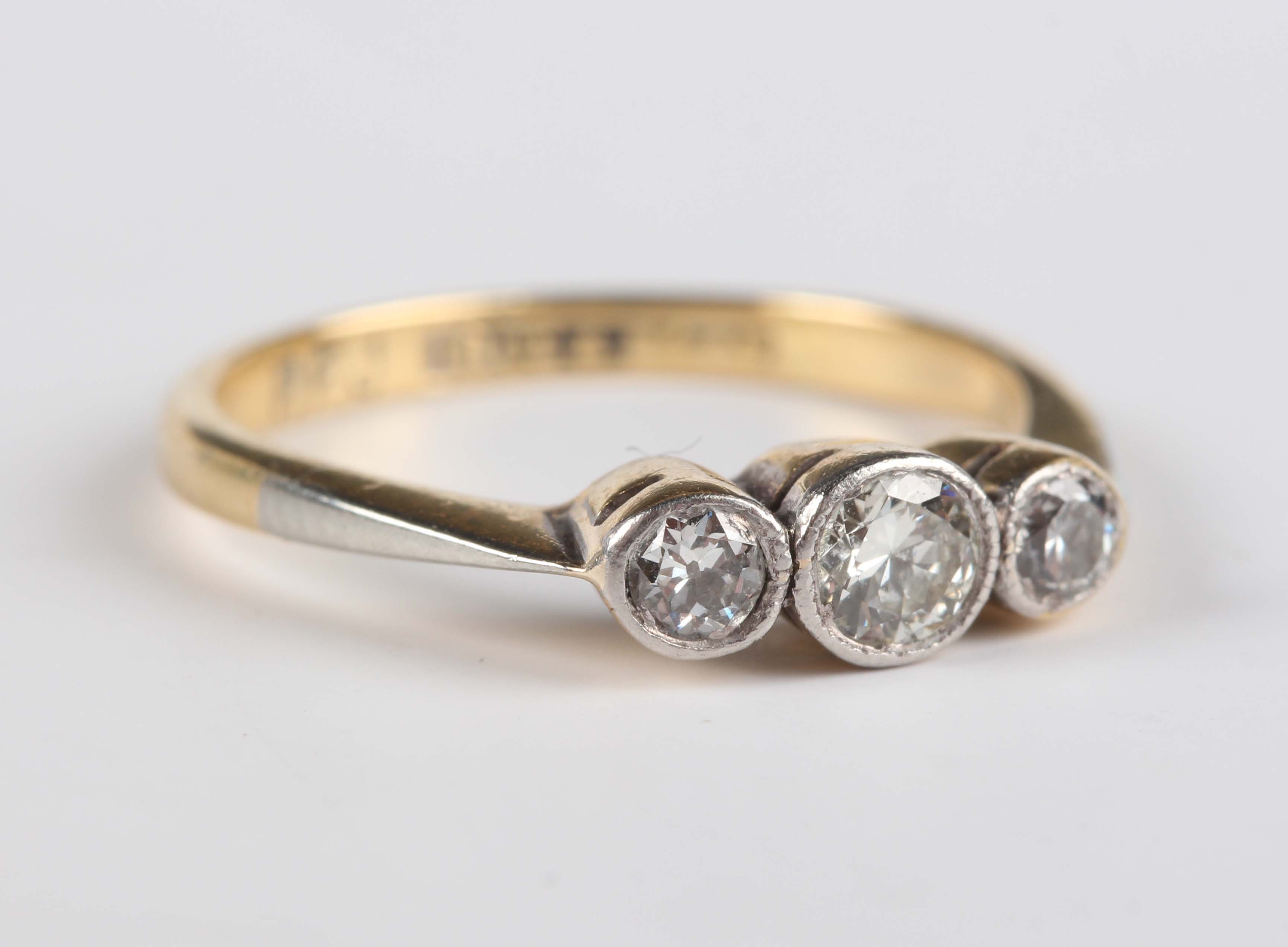 An 18ct gold, platinum and diamond three stone ring, collet set with graduated circular cut diamonds, weight 2g, ring size approx H.