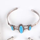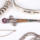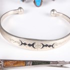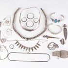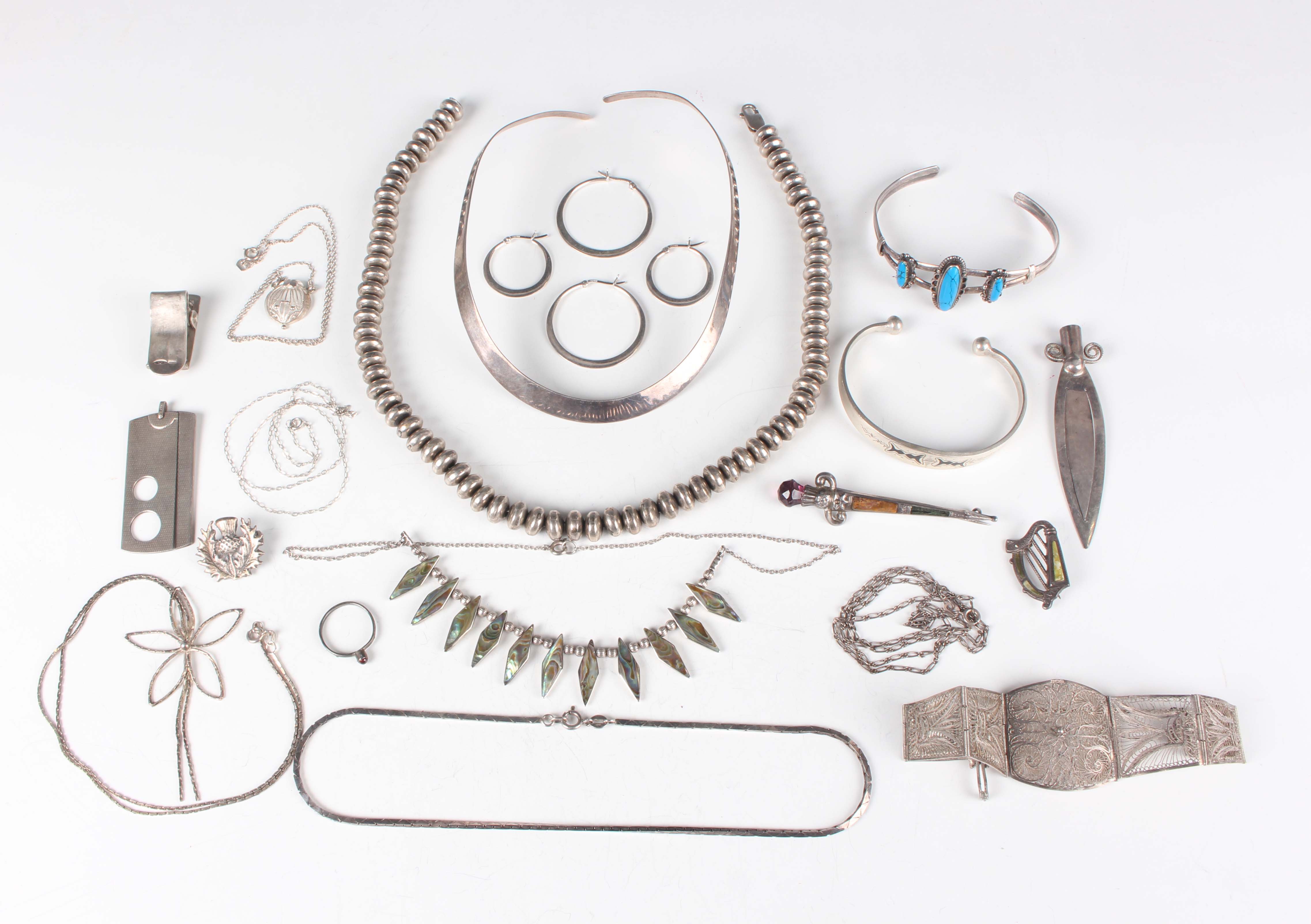A group of silver jewellery, including a collar necklace, two pairs of hooped earrings, a bangle and a bead design necklace, total weight 207.7g, together with a few further items, including a filigree bracelet, unmarked.