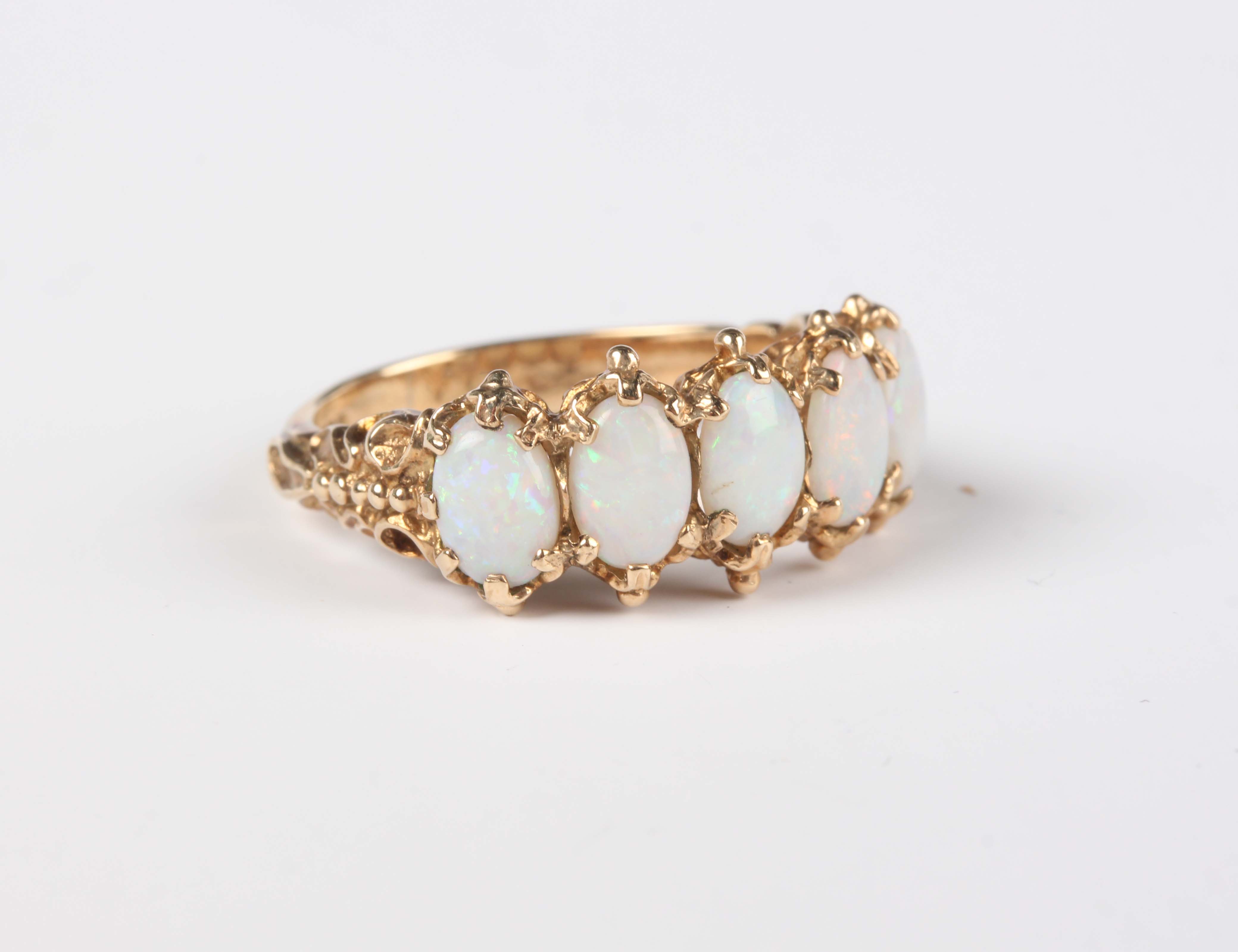 A 9ct gold and opal five stone ring, claw set with a row of oval opals, London 1992, weight 3.5g, ring size approx L1/2.