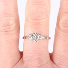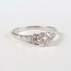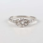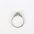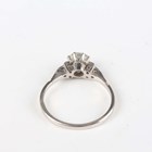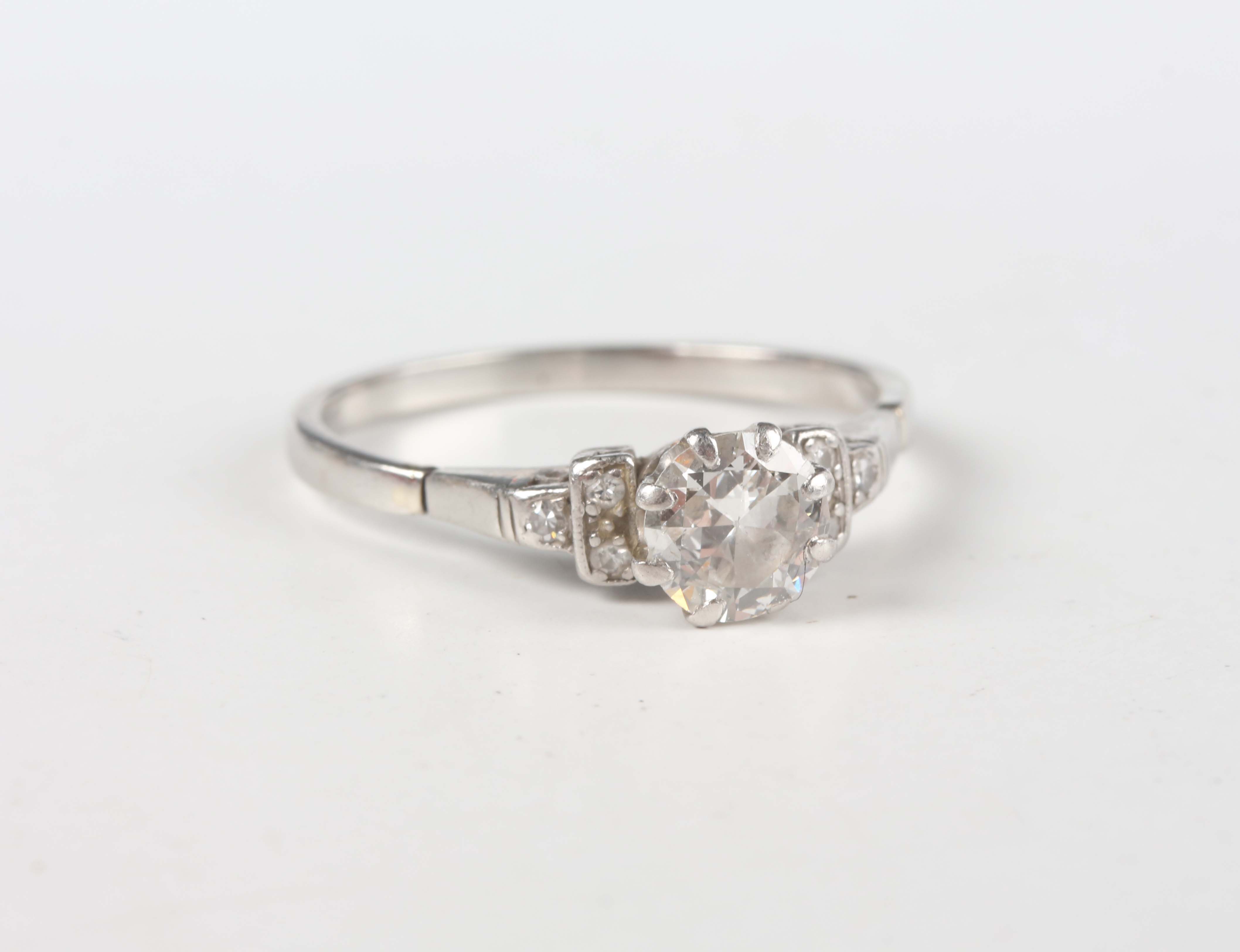 A platinum and diamond ring, claw set with the principal circular cut diamond between diamond three stone shoulders, unmarked, weight 4.1g, ring size approx Q, with a case.