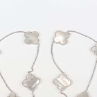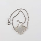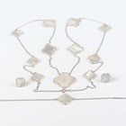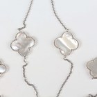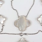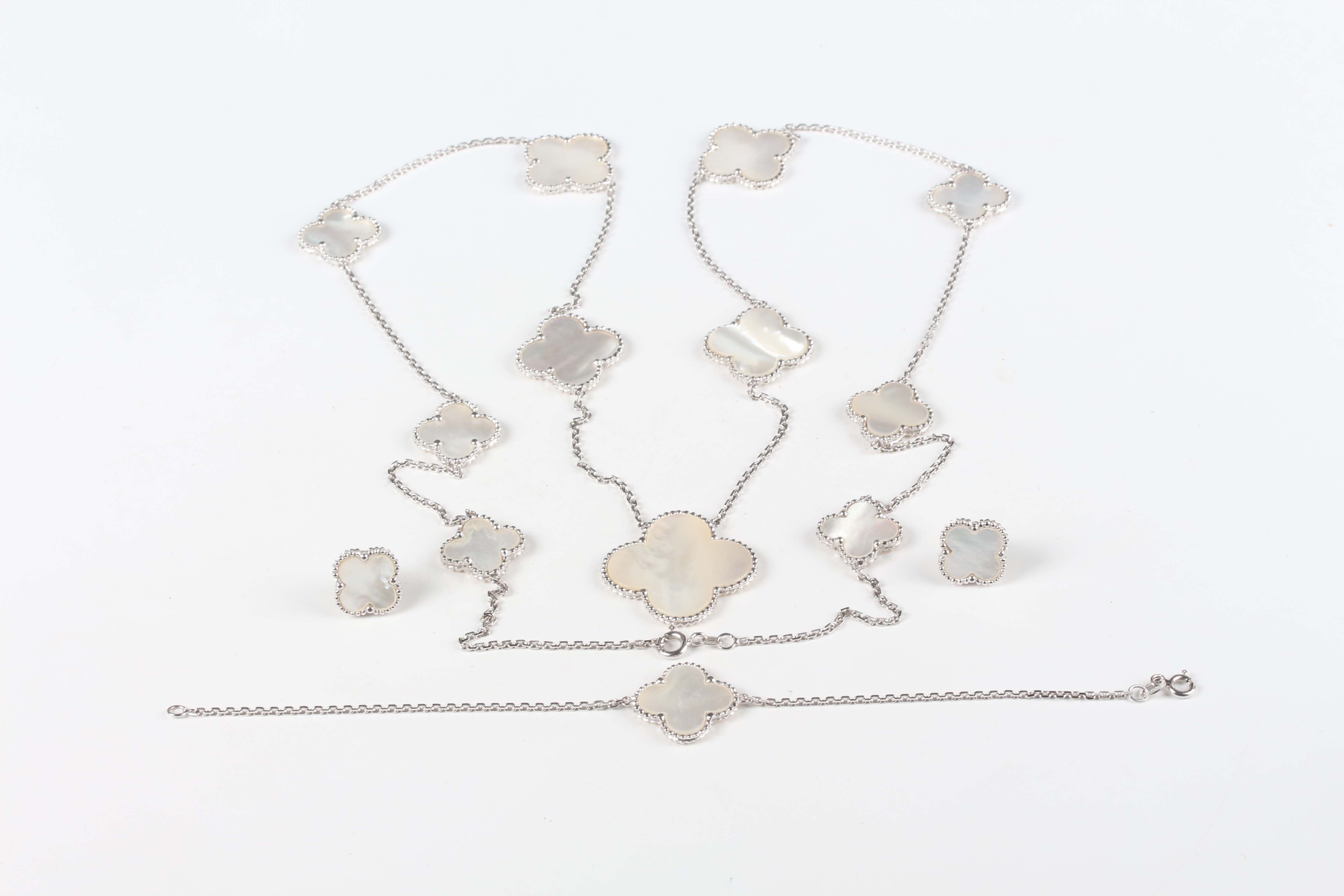A white gold and mother-of-pearl demi-parure, each with quatrefoil shaped mother-of-pearl panel links spaced on a faceted oval link chain, comprising a necklace on a boltring clasp, length 80cm, a bracelet, length 18cm, and a pair of earstuds with post and butterfly fittings, all detailed '750', the bracelet detailed 'Italy', total weight 40.8g.